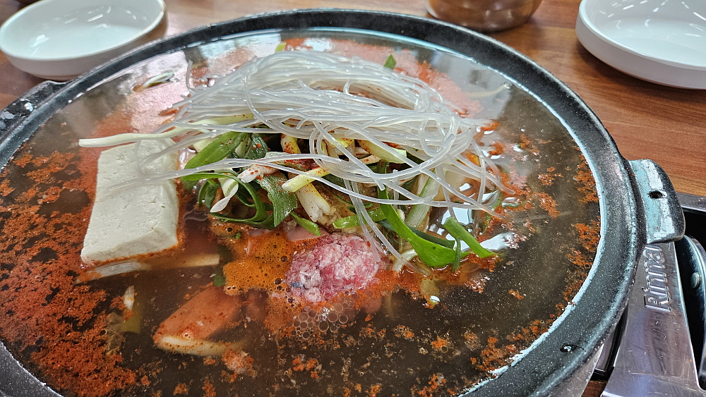 주문과 동시에 덜 조리된 찌개가 나오고 특이하게도 떡 두 덩어리를 준다. 아마도 에피타이저인 모양이다. 이런 앙증맞은 떡으로 일단 입안을 달래라는 것이겠지... 언제 끓을까 싶을 정도로 거의 조리가 되지 않은 찌개가 나왔다. 손님 상에서 최소한 10분 이상은 끓어야 먹을 수 있다. 가만히 재료를 보니 역시 소시지와 민찌라는 다짐육, 햄이 눈에 띄인다. 커다란 두부도 있고, 당면과 파채도 넉넉하게 들었다. 국물은 맑은 편이다. 아마도 야채수를 쓰는 모양이다. 약간의 고추가루가 뿌려져 연못 위에 꽃이 핀 것 같은 모양이 되었다. 이렇게 맑아 보이는 국물이 그렇게 진하게 변하는 것이다.