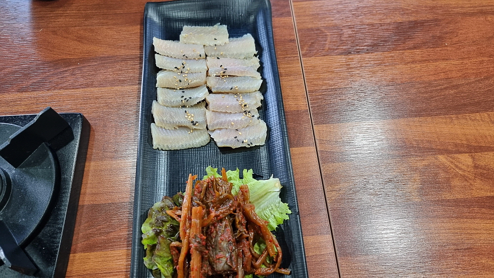 기본 찬과 함께 보쌈고기를 끝까지 데워 먹으라는 의미로 고체 연료도 나왔다. 기본찬은 백반집처럼 정갈하고 간이 센 편이었는데 괜찮았다. 이집이 점심에는 장사를 하지 않는다고 했는데 점심때 밥먹으러 오고 싶은 맛이었다. 짚보쌈을 먹고 싶었지만 홍어도 먹고 싶었는데 짚보쌈에 홍어로 세트를 만들어 주겠단다. 당연히 고마운 일이었다. 홍어를 좋아하는 사람이라면 이렇게 삼합을 먹을 기회를 놓치고 싶지 않을 것이다. 홍어삼합의 기본은 홍어와 고기와 묵은지 김치인데 이집의 묵은지도 꽤나 훌륭한 맛이었다. 보쌈이라는 고기를 자꾸 생각해서 그렇지 홍어삼합 전문점이라 해도 될 만한 곳이었다.