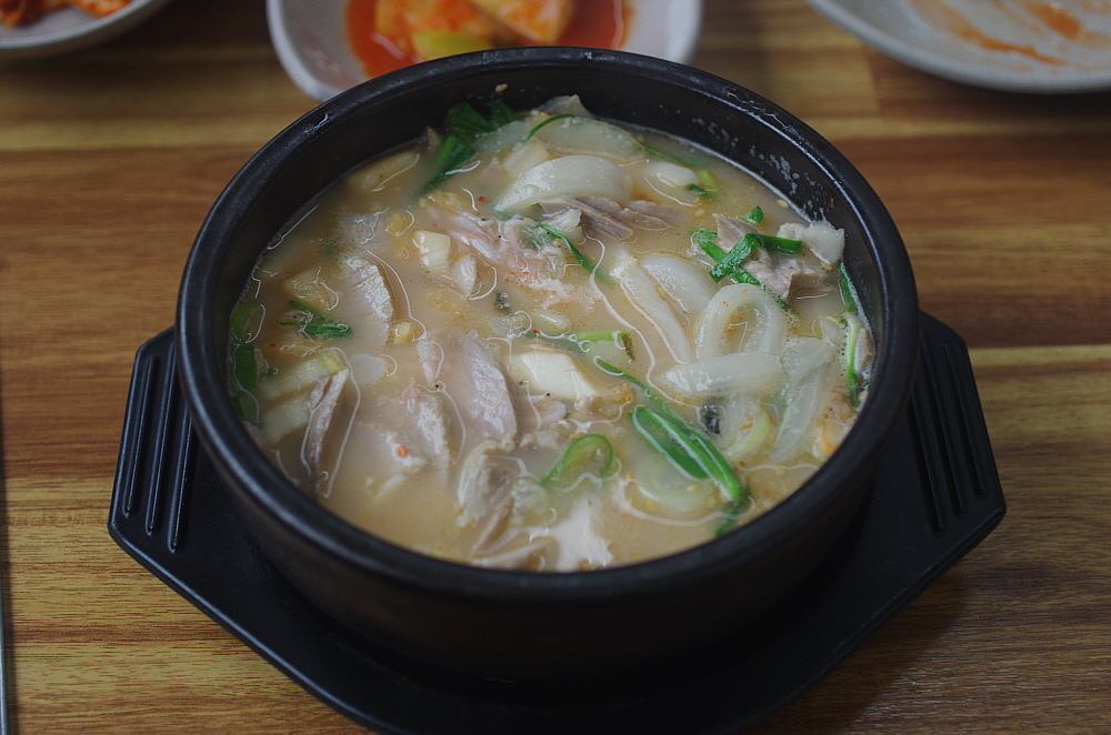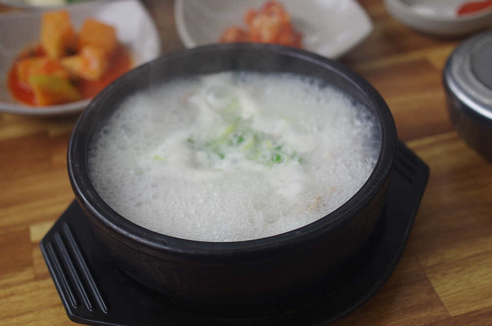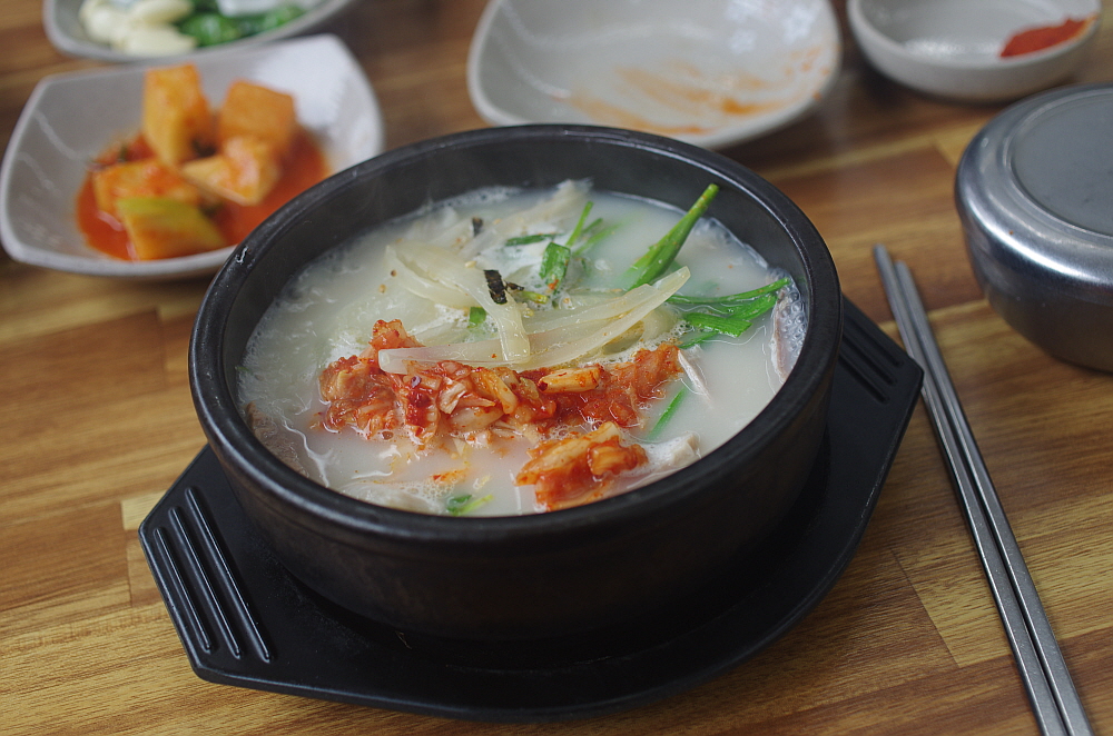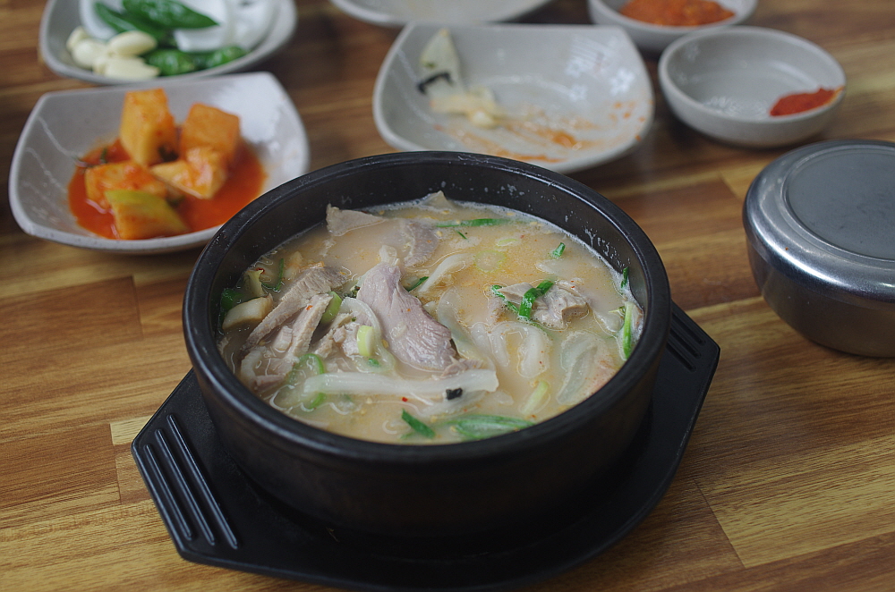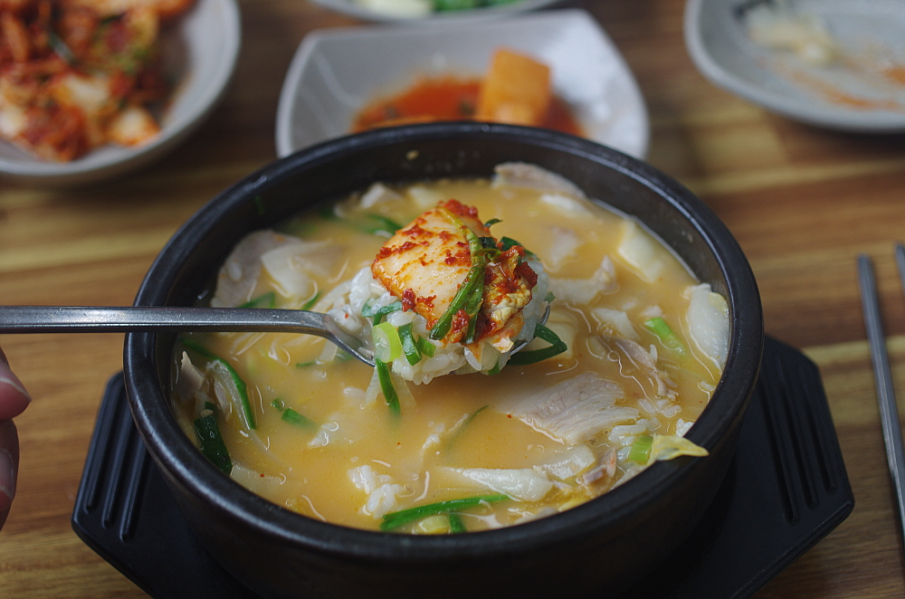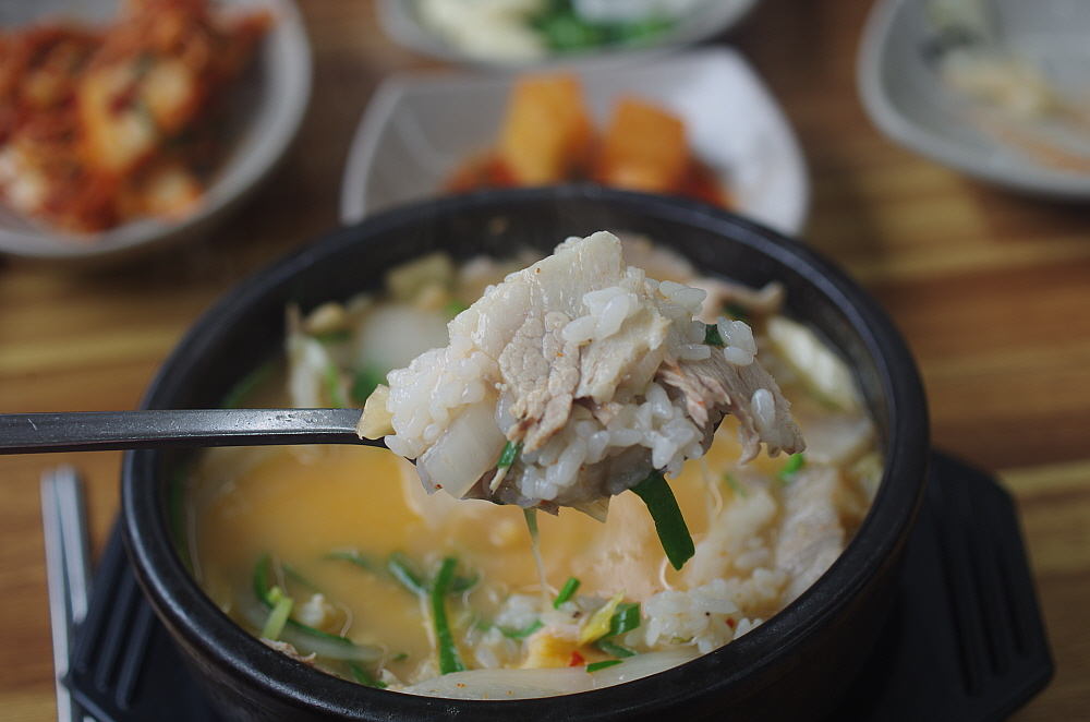 오늘의 주인공 돼지국밥도 나왔다. 뽀얀 국물이 펄펄 끓고 있는 모습이 우리가 늘 먹었던 국밥의 전형적인 비주얼이었다. 순대국처럼 돼지국밥도 손님의 취향대로 약간의 레시피로 조리를 해야 한다. 변호인이라는 송강호 나오는 영화의 대사처럼 정구지, 즉 부추무침을 많이 넣고, 다대기 양념장도 넣고, 잘게 썰어 나온 김치와 새우젓도 넣는다. 순대국과 다른 점은 들깨가루와 고추씨기름이 없다는 것이다. 돼지국밥은 더 담백하고 라이트하게 먹는 국밥이라는 반증이다. 건더기도 좀 다른데 돼지국밥은 순대국처럼 내장이 들어가는 것 같지 않았다. 어느 부위인지 몰라도 다 돼지고기 같았다.