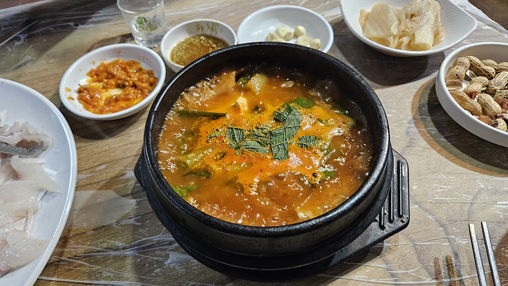 회가 남는 것이 아까워 매운탕을 주문하여 거기에 넣고 함께 끓여 먹기로 했다. 그런데 이것도 참 특이하게 매운탕을 손님상에서 끓이는 것이 아니라 미리 다 끓여서 뚝배기에 담아 온다. 이런... 아주 강렬한 매운맛은 아니지만 양념은 무척 진했다. 우린 샤브샤브처럼 남은 생선회를 매운탕에 데쳐(?) 먹었다. 그래도 참 맛이 좋았다. 이런들 어쩌랴... 내 입맛에 좋으면 그만이지... 주변의 손님들을 보니 술을 마시는 사람보다 그냥 밥처럼 생선회를 양으로 먹는 사람들이 더 많았다. 우리같은 이방인들만 생선회를 앞에 놓고 깨작댈 뿐이다. 아무튼 다시 한 번 바닷가 사람들이 회 사랑이 대단하다는 것을 깨닫게 된 저녁이었다.