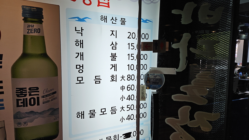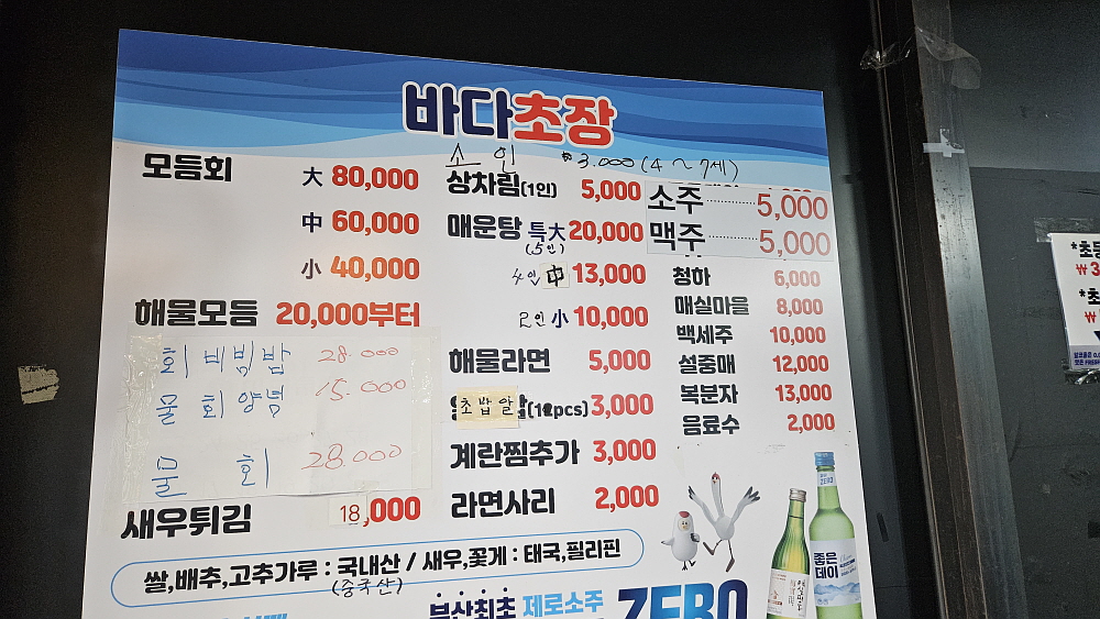 일단 메뉴판의 가격을 보고 놀랐다. 현지인들이 맛집답게 정말 착한 가격이다. 사실 횟집이라고는 하지만 여기는 근처의 회 판매장에서 손님이 직접 회를 떠와서 상차림을 하고 먹는 집이다. 물론 우리처럼 회를 따로 사가지고 가지 않고 식당에서 주문해도 된다. 그러면 주인장이 인근 회 판매장에서 사이즈에 맞게 회를 떠 가지고 온다. 참 특이한 방식이다. 이말은 회에서는 별로 마진을 남기지 않는다는 말이다. 아마도 광안리 근처에 있는 엄청난 규모의 회 도매상들이 있어 가능한 영업방식이 아닐까 한다. 아무튼 손님 입장에서는 이런 시스템이 너무 좋다.