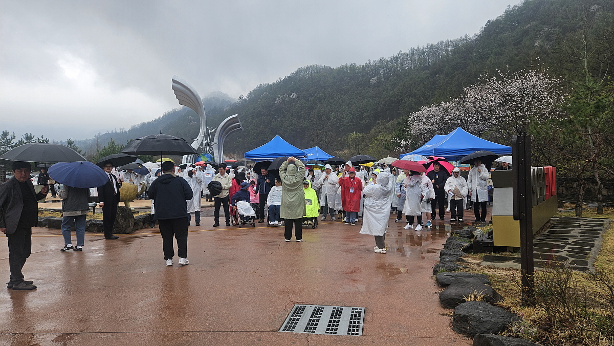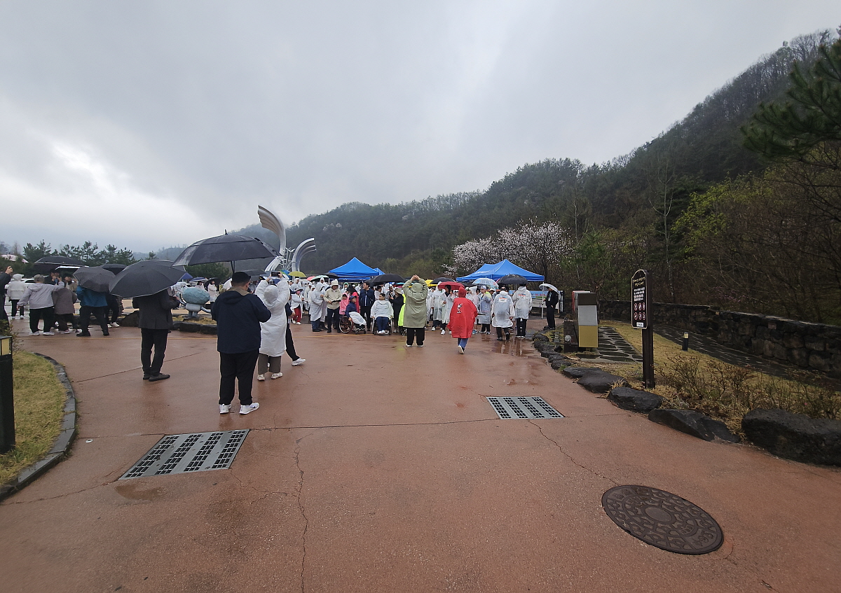 이날 걷기 코스는 비둘기낭 주차장을 출발하여 하늘다리를 지나 서바이벌 밀리터리 경기장을 다녀오는 왕복코스였다. 거리는 약 3km정도 된다는데 천천히 걸으면 한 시간 정도 걸리는 거리다. 걷는 것이 다소 불편한 장애인들도 경기를 한다기 보다는 산책을 한다는 생각으로 이 거리를 모두들 완주하였다. 조금 비가 내리긴 했지만 오히려 직사광선을 피해 덥지 않은 날씨라 생각하면 걷기엔 더 좋은 컨디션이라 할 수 있었다. 평소에도 자주 오가는 곳이지만 이렇게 비가 내리는 길을 걷다보니 또 남다른 느낌이 들었다. 이번 비 때문에 조금 늦게 만개했던 벚꽃들도 모두 져 버릴 것이다. 그렇게 세월이 가는 것이겠지... 하지만 비를 맞으며 걸었던 특별한 제1회 핸디 마라톤 이야기는 앞으로도 계속 될 것이다.