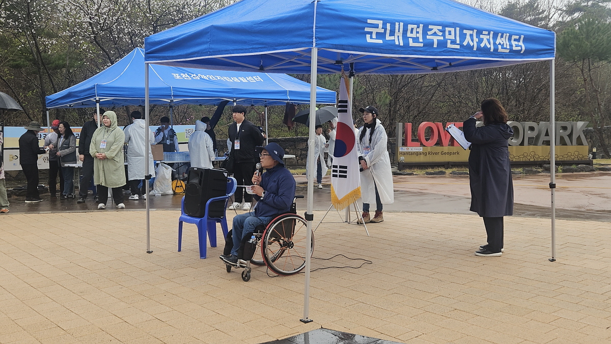 그래도 천만 다행인 것은 오전에는 그나마 빗발이 그렇게 굵지 않았다는 것이다. 그래서 우리는 마라톤까지는 아니라도 걷기 대회 비슷하게 할 수 있었다. 이날은 포천장애인자립생활센터에서 마련한 유니버설디자인 핸디 마라톤이 열리는 날이었다. 아침 10시에 영북면 비둘기낭 주차장에는 장애인과 비장애인이 함께 하는 첫 번째 마라톤 대회의 의미를 알기 때문에 빗속에서도 사람들이 하나 둘 모여 들었다. 핸디마라톤이라는 말은 휠체어를 미는 손을 의미하는 것으로 마라톤에 참가한 장애인을 상징적으로 표현하는 말이다.