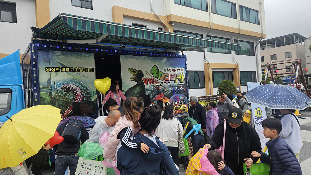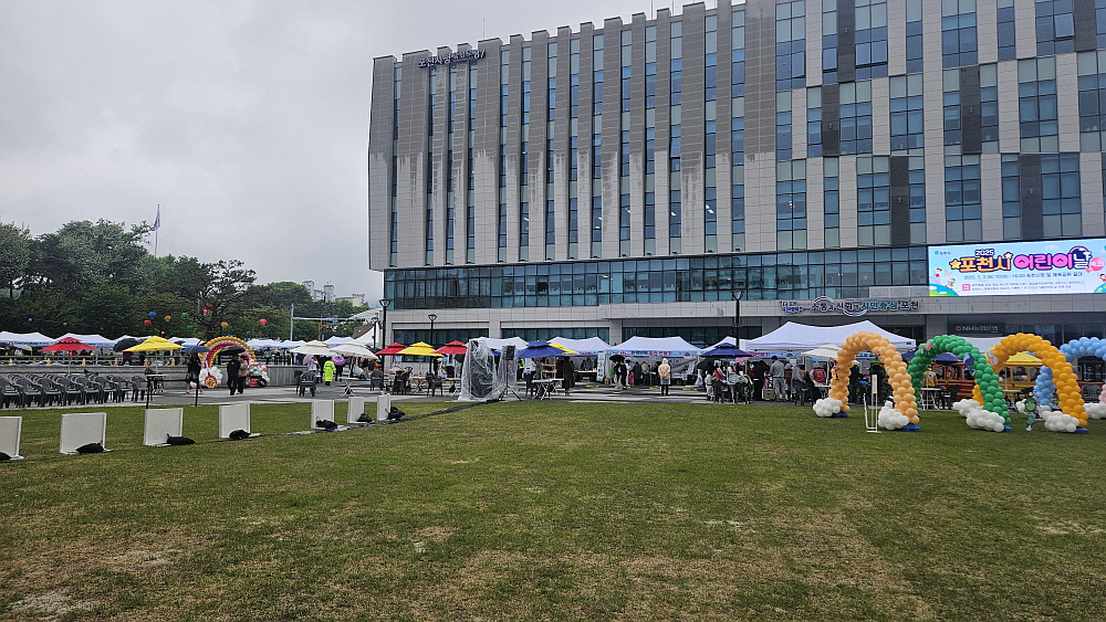 오전 10시 행사의 공식적인 시작은 이 시간이었다. 하지만 어김없이 비는 내리고 있었다. 봄비는 기온을 끌어 내린다. 그래서 아침 기온은 10정도 밖에 안 되었다. 춥다는 느낌이 들 정도였다. 그렇지만 이미 행사 준비를 한 사람들이 많아 포천시청 광장에는 여러 행사 부스가 차려졌다. 행사장 한 쪽에는 과연 오늘 가동할 수 있을까 걱정스러운 작은 바이킹 놀이기구도 있었다. 어린이날 행사다 보니 주로 어린이들을 즐겁게 하는 기관과 단체들이 행사에 참여했다. 당연한 일이다.