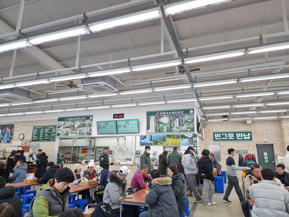 망향국수 본점은 마치 고속도로 휴게소 같은 분위기이다. 너무 많은 손님들이 몰리기 때문에 다른 망향국수 집들처럼 먼저 자리를 정하고 주문을 하는 방식이 아니라 키오스크로 주문한 뒤 순서를 기다리면 본인 번호가 호명될 때 나가서 음식을 타오는 방식이다. 이런 방식은 딱 고속도로 휴게소의 방식이라 하겠다. 신병 입소 인파와 점심 시간이 겹치면서 이날도 인산인해 그 자체였다. 그렇지 않아도 장사가 잘 되는 집인데 바로 앞에 부대까지 도움을 주는 형국이다.