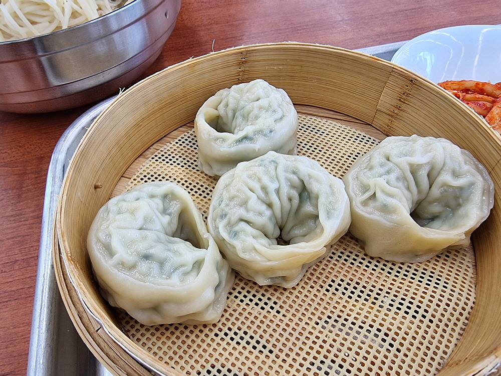 우리는 비빔국수 보통과 곱배기, 잔치국수와 만두까지 이집의 거의 전 메뉴를 주문했다. 만두는 사진처럼 4알이 나온다. 분명 공장 만두인데도 이상하게 여기서 먹으면 맛이 좋다. 분위기 탓일까? 본점의 비빔국수 맛은 망향국수 맛의 전형이라 하겠다. 달고, 맵콤하고, 시큼하고, 시원하다. 이런 맛은 정말 사람 기분을 좋게 만드는 마법이 있다. 만두는 비빔국수의 양념에 찍어 먹어야 한다. 간장을 쓰는 것보다 이 편이 훨씬 맛이 좋다. 여긴 소면을 쓰지 않고 중면을 사용하는 것으로 유명하다.
