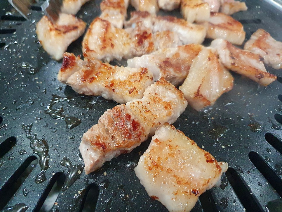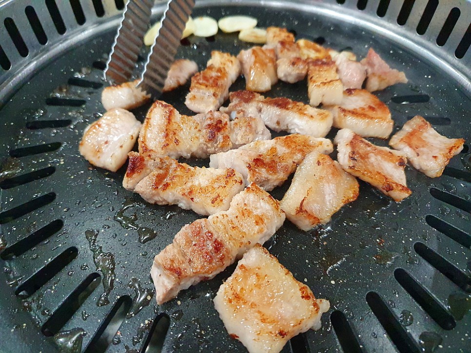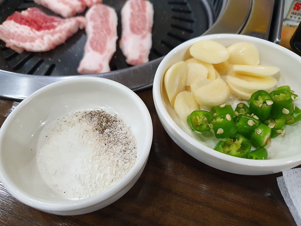 특히 저 파절이는 예술이었다. 어떻게 양념을 했는지 모르겠지만 파의 알싸한 매운 맛과 향이 살아 있으면서 달달한 양념의 조화가 기가 막혔다. 고기를 먹기 위해 파절이를 먹는 것이 아니라 고기 맛을 업그레이드 시켜주기 때문에 파절이를 꼭 먹어야 했다. 이런 반찬들이 있으니 고기 덜 먹는 사람도 얼마든지 만족스러운 저녁을 먹을 수 있는 곳이다. 고기가 익으니 정말 그 진가가 제대로 발휘되었다. 그냥 먹어도 맛나고, 소금을 찍어도 맛나고, 파절이와 쌈을 싸서 먹어도 일품이다. 이러면 정말 과식에 과음이 되는데...