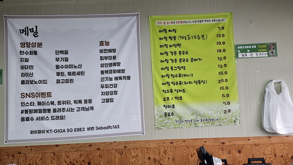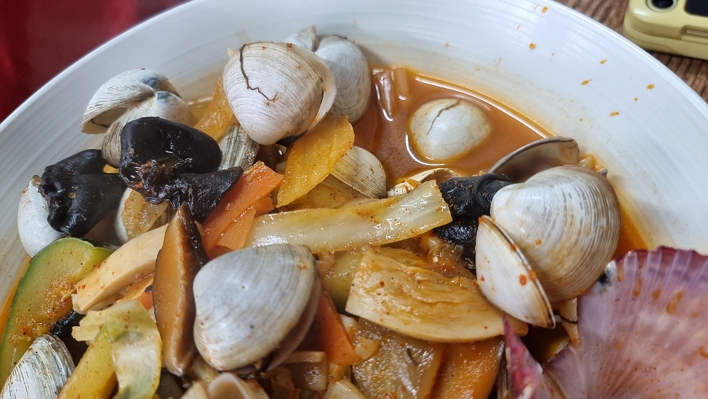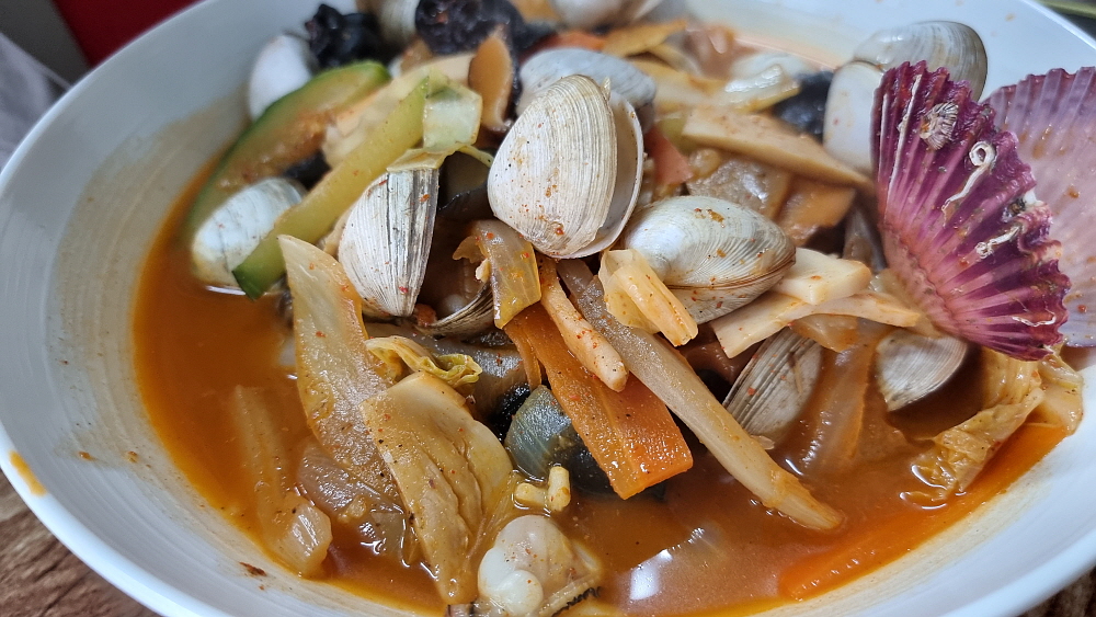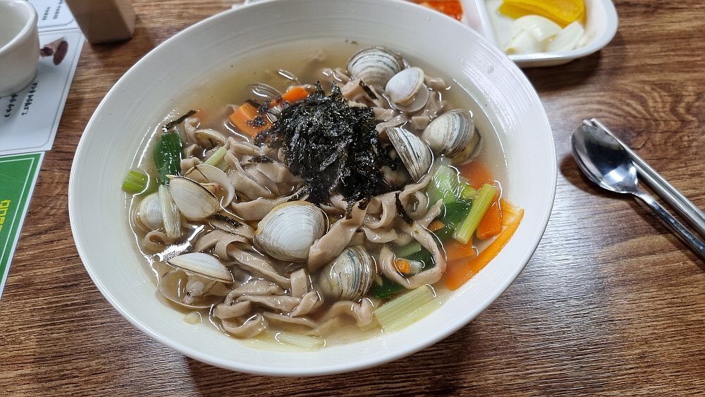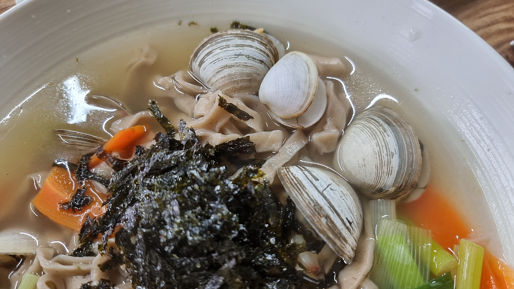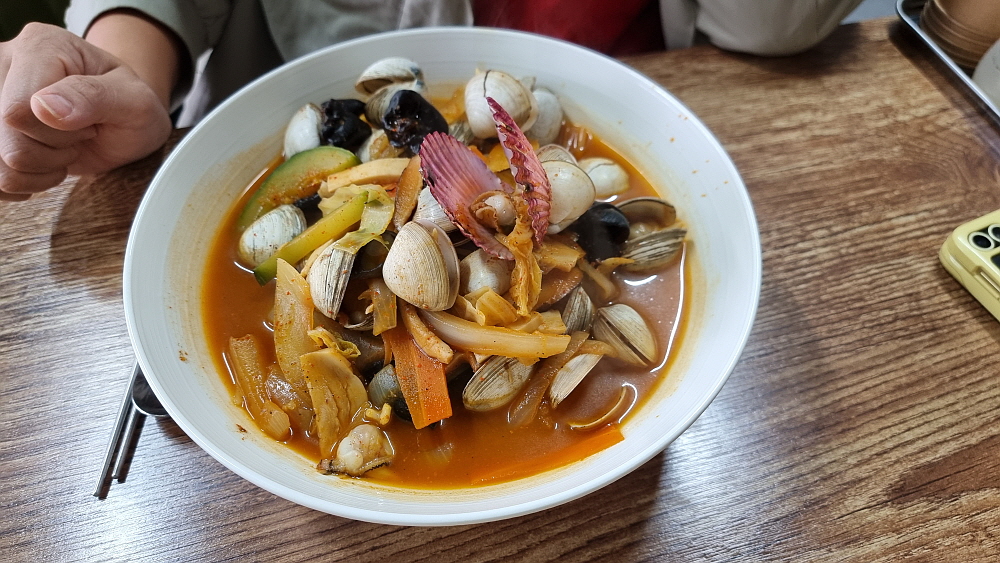 짬뽕을 파는 곳이다 보니 당연히 짜장면도 있다. 그것도 메밀면이 기본이란다. 과연 메밀에 진심인 곳이다. 메밀면은 밀가루에 비해 탄력이 떨어지고 단맛도 덜하다. 그래서 막국수나 냉면에 사용하지만 특별한 제조방법이 필요하다. 그리고 요즘 메밀은 밀가루에 비해 가격이 너무 비싸다. 이유는 잘 모르지만 밀가루보다는 덜 보편적인 재료다 보니 물가에 둔감한 탓도 있을 것이다. 아무튼 우리는 이집의 시그니쳐 메뉴인 짬뽕과 밖에 붙여놓은 신메뉴 동죽 칼국수를 주문했다. 중국집에 칼국수라는 컨셉도 매우 특이한 것이다. 우동은 있어도 칼국수를 파는 곳은 못 본 것 같다.