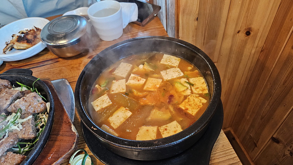 잘익은 된장찌개를 생선과 함께 먹는다면 이미 성공한 한 상이다. 파는 된장이 아니라 집된장의 투박하면서 건강한 맛이 그대로 전혀지는 이집의 된장찌개는 조금 늦게 등장했다. 주인공인 셈이다. 된장찌개와 생선 한 토막이면 다른 반찬이 필요없다고 할 수 있다. 참 건강하면서 즐거운 한 끼였다. 모두 함께 모여 밥을 먹으니 식구들이라도 된 것 같았다. 아트벨리 진입로에 다른 식당들도 가봤지만 이날 가본 이집이 진정한 밥집이 아닐까 한다. 가격도 합리적이고 말이다. 예전엔 여기서 고기에 술 한 잔도 했던 것 같다. 이렇게 이날의 점심도 맛나고 푸짐하게 잘 채워졌다.