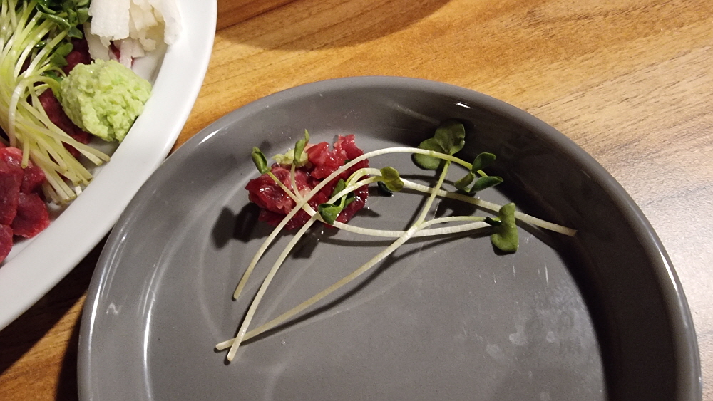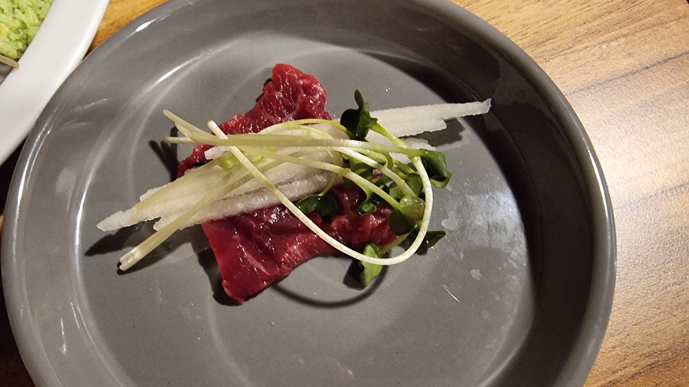 육회나 사시미는 일단 뻘건 비주얼로 사람을 한 번 사로 잡는다. 그리고 진한 육향을 맡으며 기름장 같은 곳에 찍어 먹을 때 야생의 소 맛을 보면서 다시 한 번 만족감이 밀려 온다. 와시비를 찍어 먹거나 간장에 먹기도 하고 예전에 처음 육회를 먹었을 때는 달달한 설탕같은 것을 뿌려 계란 노른자에 찍어 먹기도 했다. 일단 별다른 양념을 하지 않아도 소고기 육회는 달달한 맛이 난다. 아마도 신선한 소고기에서 나타나는 특징일 것이다. 보기엔 이래도 양이 상당히 많은 편이었다. 이렇게 고급스런 안주로 술 한 잔 한다면 호사 중에 호사가 아닐까 한다.