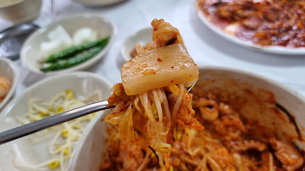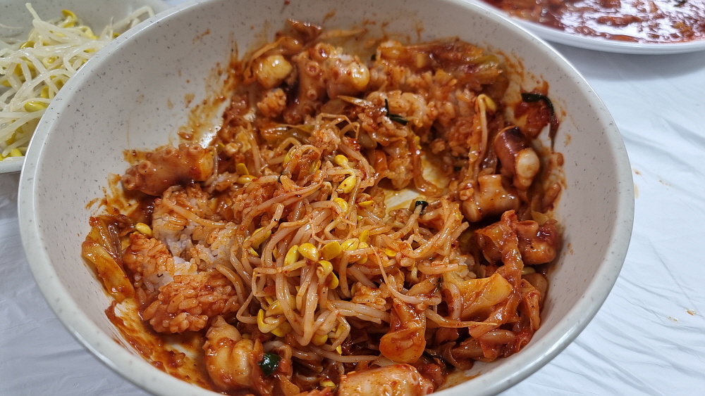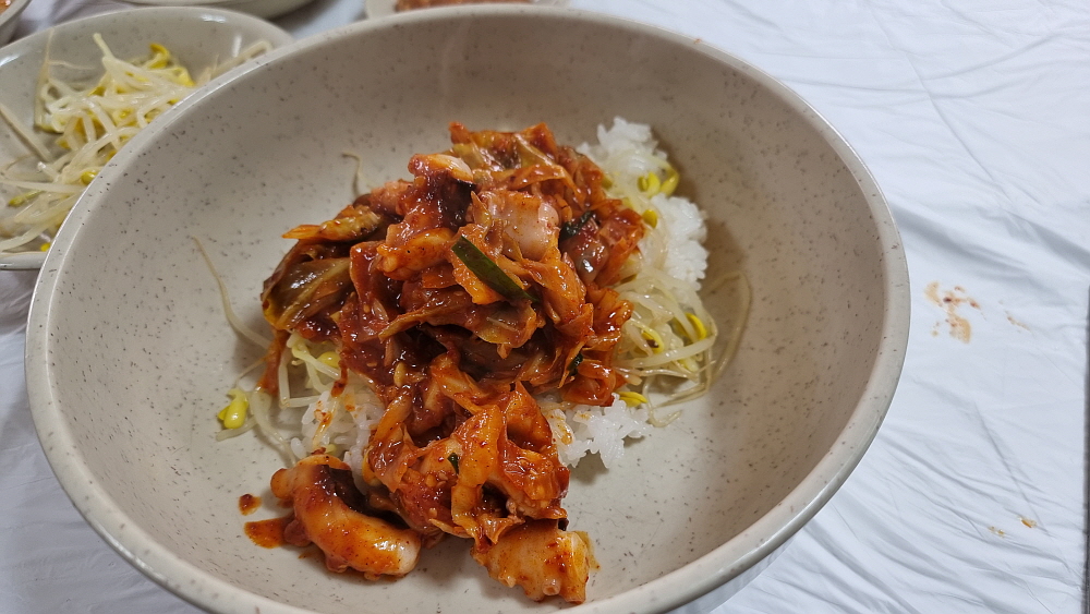 그리고 별것 아닌 거 같지만 함께 나온 석박지가 너무 시원하니 맛이 좋았다. 담백하다고 할까? 그런 식감이었다. 잘 익은 낙지와 담백한 콩나물과 고슬한 밥의 조화가 참 훌륭했다. 우린 말 그대로 정신없이 먹었다. 이렇게 혼을 빼고 먹을 정도로 소머리국밥 전문집의 낙지볶음의 맛이 좋았다. 아이러니하게도 말이다. 나중에 리뷰를 보니 여긴 이렇게 낙지를 먹는 손님이 더 많은 것 같다. 이런 손재주라면 분명 소머리국밥도 훌륭할 것이다. 언제 다시 문경에 오게 될지 몰라도 문경읍에 오면여긴 분명히 한 번 더 와야 할 것 같다.