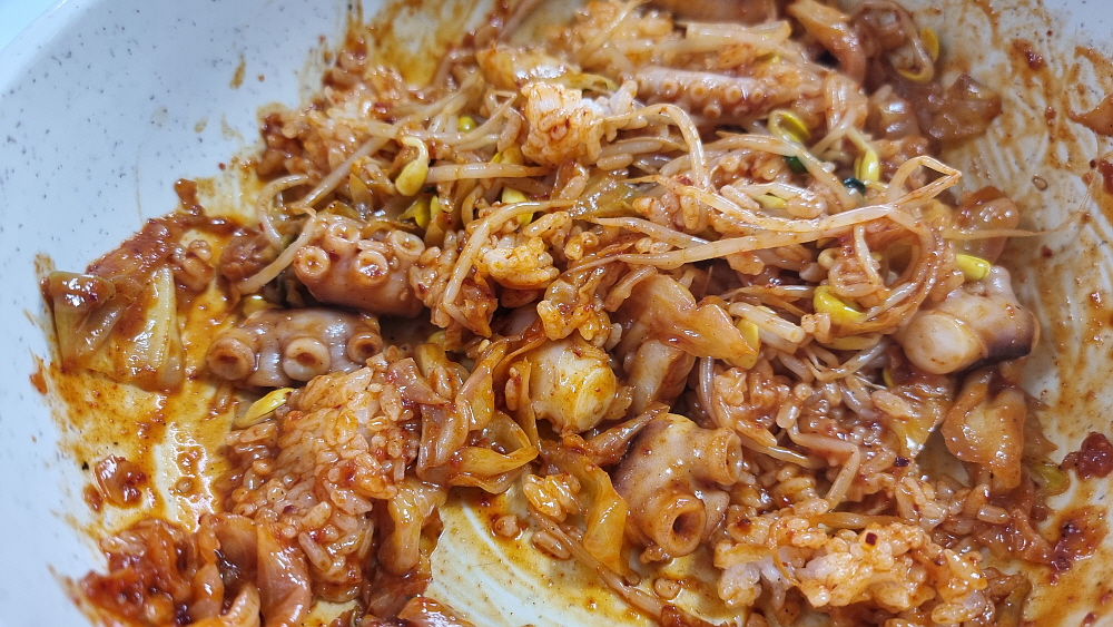 고슬 고슬 잘 지어진 밥에 강렬한 빨간 양념이 자극적인 낙지볶음이 나왔다. 양배추도 넉넉하게 들어있고, 통깨가 솔솔 뿌려져 있는 정말 맛나 보이는 낙지볶음이 나왔다. 아주 매워 보였지만 막상 먹어보니 그렇게 고통스러울 정도로 맵지는 않았다. CF에 나오는 말처럼 '맛있게 매웠다.' 맵질이기 때문에 아무런 양념도 하지 않고 데친 콩나물을 좀 과하다 할 정도로 많이 넣고 낙지볶음을 넣고 잘 비볐다. 이렇게 먹는 것이 여기 룰이라 하겠다. 옆에 있는 고추를 한 입 베어 물었는데 어찌나 맵던지... 역시 경상도의 강력한 맛이다.