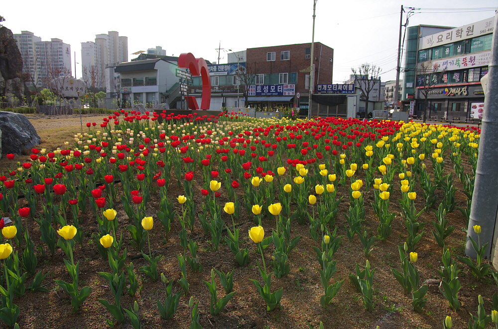 소흘읍 하송우 사거리에 새로 조성된 튤립 꽃밭에서 봄을 만끽한다.