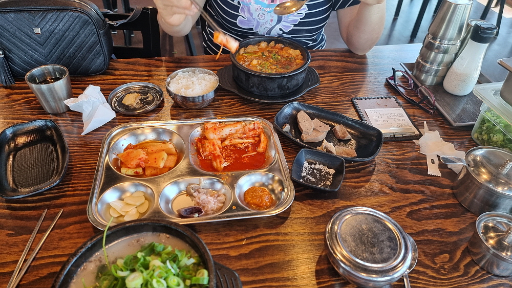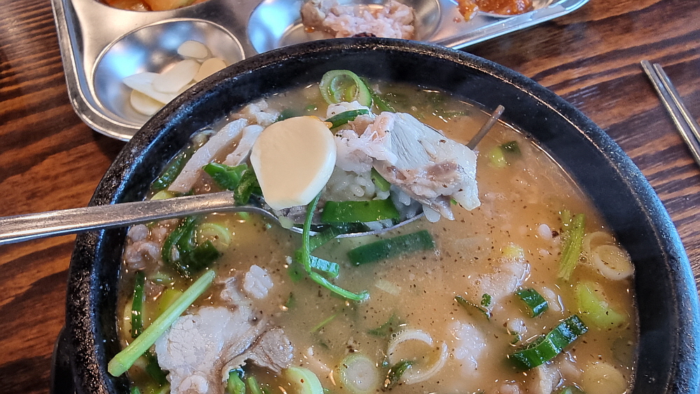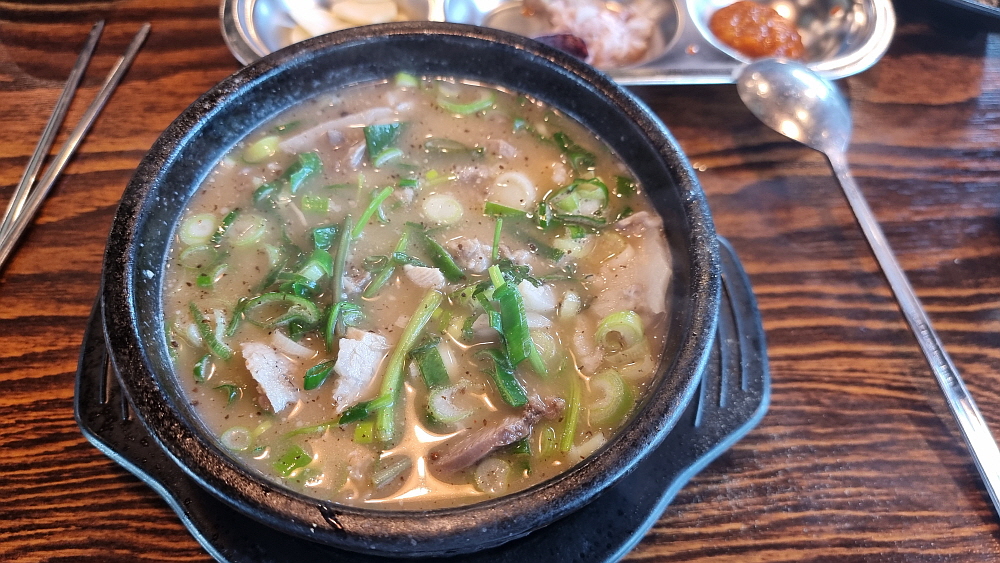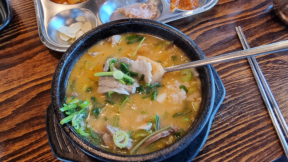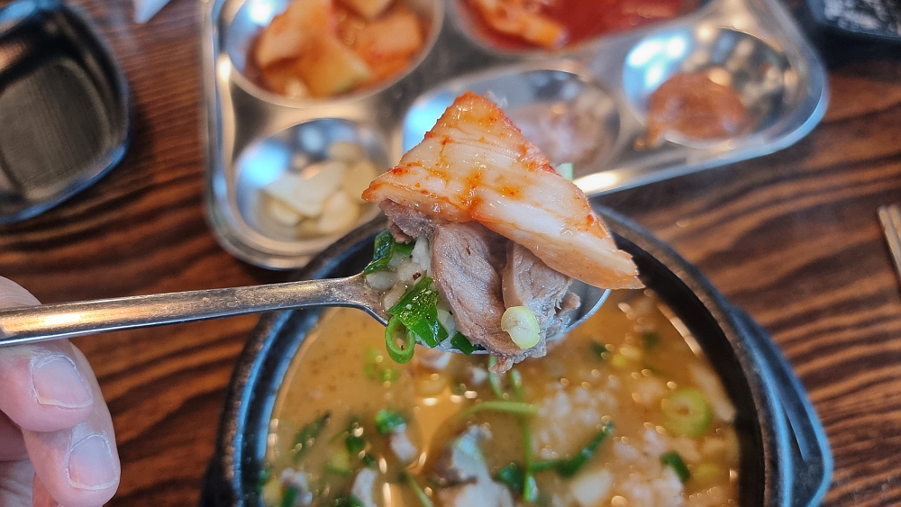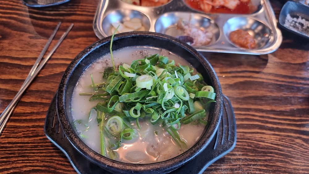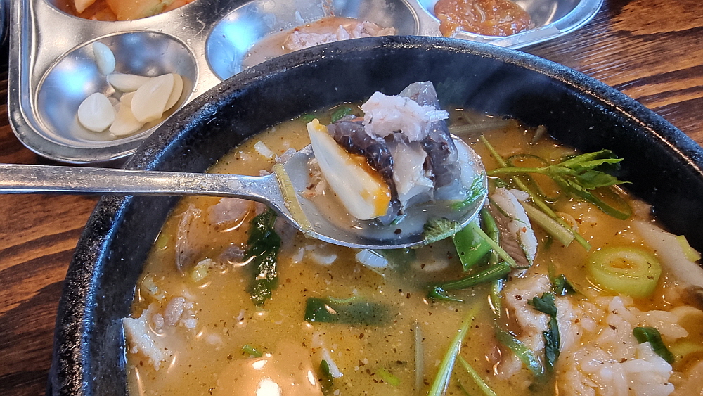 우리는 얼큰 순대국과 일반 순대국을 주문했는데 얼큰 순대국은 순대국이라기 보다는 해장국에 가까운 것이었다. 얼큰하고 진한 국물이라는 점에선 반가운 일이지만 담백한 순대국과는 거리가 있었다. 개인적으로는 얼큰 보다는 시그니쳐 순대국이 더 낫더라는... 건더기가 푸짐하게 들어 있어 가격이 싸다는 것이 무색할 정도였다. 사람에 따라 취향이 다르겠지만 일단 양념장과 파를 듬뿍 넣는것이 상식이다. 거기에 새우젓과 들깨가루는 알아서 넣는 것이고, 고추씨기름도 넣고 후추까지 넣는다. 담백한 국물이 양념들로 새롭게 변신하는 순간이다.