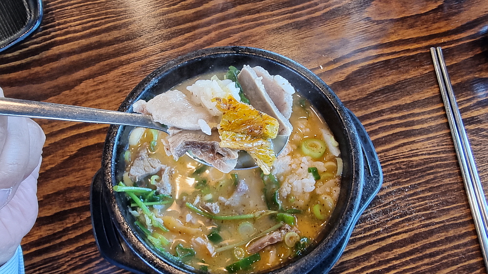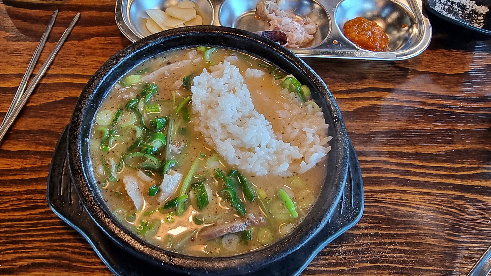 우리는 얼큰 순대국과 일반 순대국을 주문했는데 얼큰 순대국은 순대국이라기 보다는 해장국에 가까운 것이었다. 얼큰하고 진한 국물이라는 점에선 반가운 일이지만 담백한 순대국과는 거리가 있었다. 개인적으로는 얼큰 보다는 시그니쳐 순대국이 더 낫더라는... 건더기가 푸짐하게 들어 있어 가격이 싸다는 것이 무색할 정도였다. 사람에 따라 취향이 다르겠지만 일단 양념장과 파를 듬뿍 넣는것이 상식이다. 거기에 새우젓과 들깨가루는 알아서 넣는 것이고, 고추씨기름도 넣고 후추까지 넣는다. 담백한 국물이 양념들로 새롭게 변신하는 순간이다.