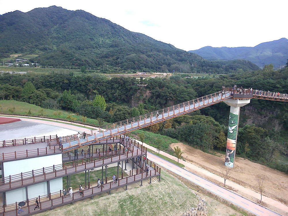 행사장 입구부터 가장 먼저 눈에 띄는 것은 역시 이번에 개통한 Y형 출렁다리이다. 그냥 말로만 들었을 때와 직접 눈으로 봤을 때와는 정말 다른 느낌이었다. 드론을 이용해서 위에서 사진을 찍어보니 확연한 차이가 눈에 들어왔다. 물리적으로 만들기 힘든 모양으로 국내 최장의 길이를 자랑한다. 물론 안전하게 만들었겠지만, 다리를 건너자면 왠지 무섭기도 하다. Y형 출렁다리를 건너면 역시 이번에 새로 만들어진 가람누리 문화공원이 있다. 여기서도 한탄강의 아름다운 모습과 페스타 행사장을 전망대를 통해 조망할 수 있다.