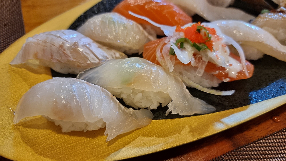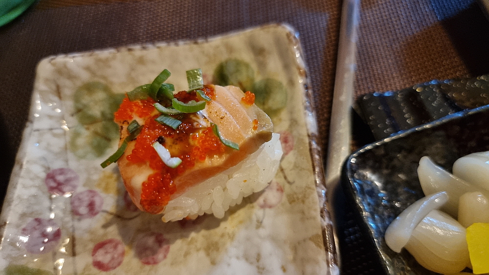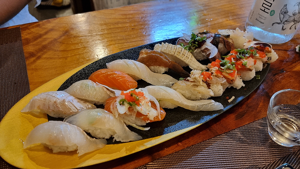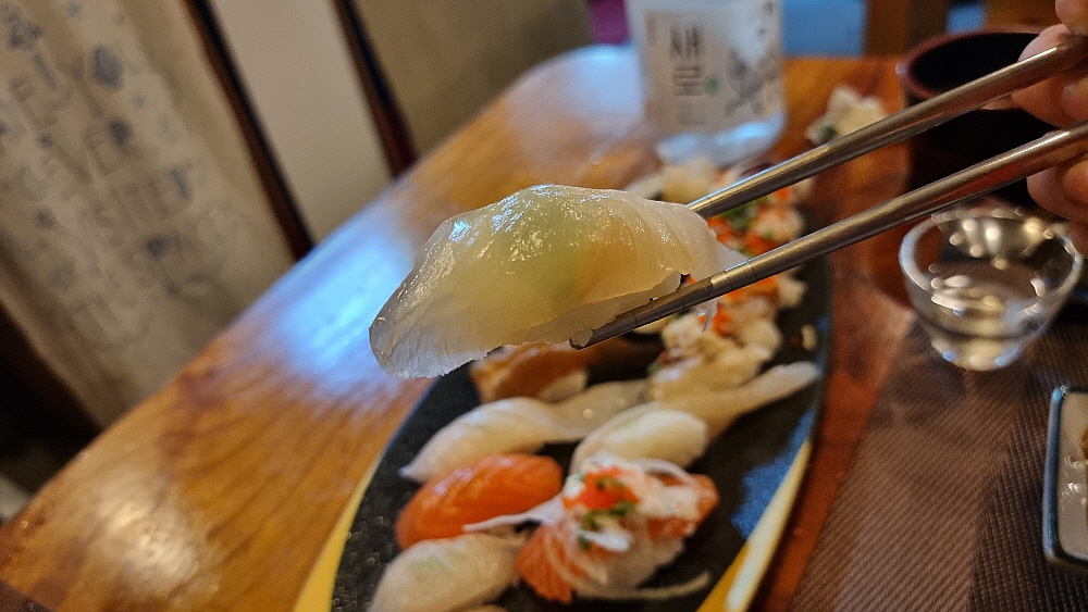 다음에 나온 것은 이집의 또 다른 특징적인 메뉴인 스시이다. 생선초밥이라 불리는 스시도 요즘엔 퓨전 재료를 위에 올리는 경우가 많지만 여긴 생선회가 더 많이 나온다. 그만큼 생선회에 자신이 있다는 말이 되겠다. 정통의 스시는 밥보다는 아무래도 생선이나 위에 올려지는 재료의 맛이 더 좋아야 하고 그만큼 크기도 커야 한다. 생선회가 밥을 온통 덮은 모양의 이집 스시는 제대로 된 모양이다. 이런 초밥은 소주보다 청주나 사케를 먹어야 한다. 음식의 궁합으로 따지자면 이런 안주와 술의 조합은 글쎄 누가 만들었다기 보다는 자연스럽게 사람들 사이에서 정해진 것이 아닐까 한다.