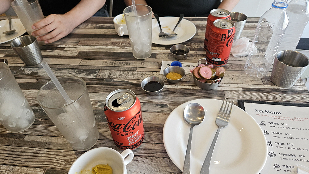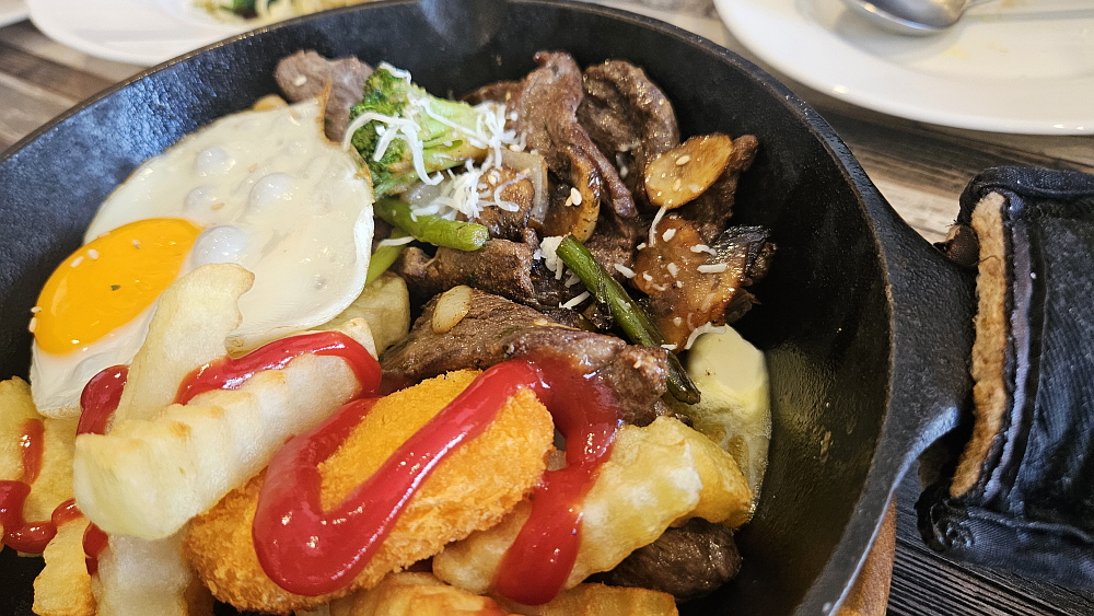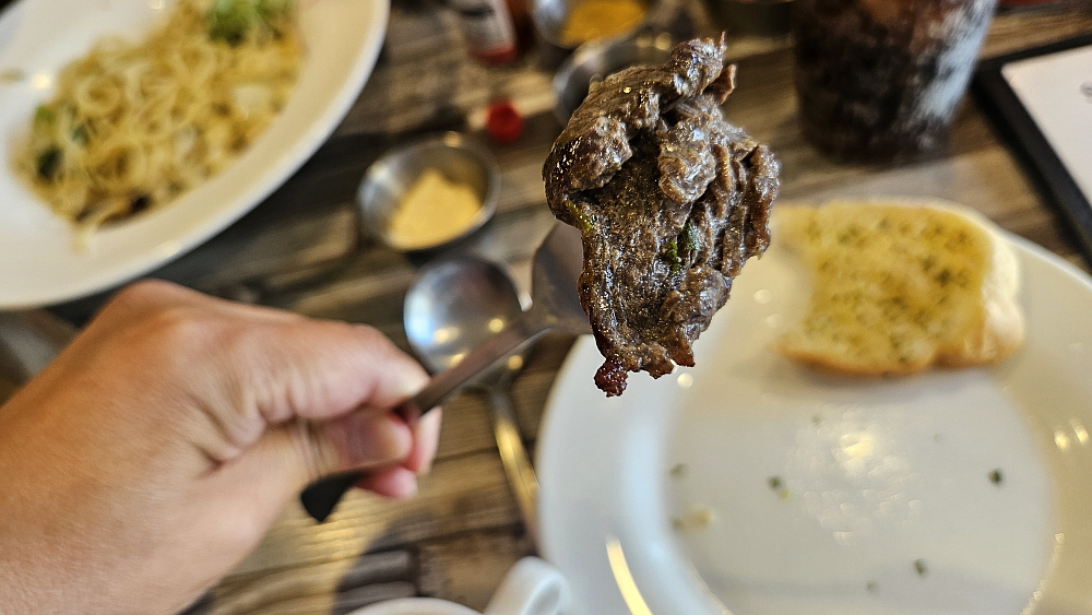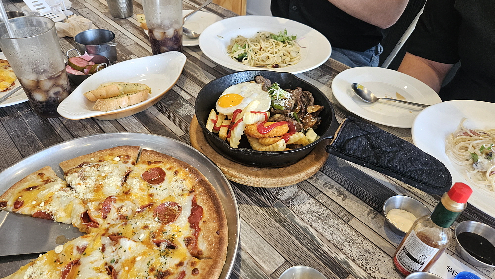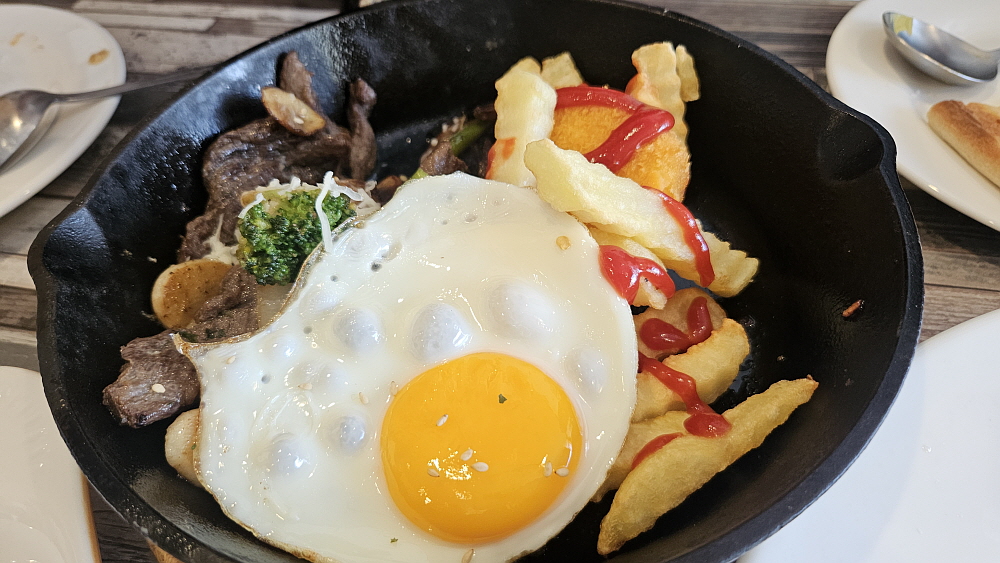 마지막은 등심 스테이크 였는데 생각해보니 주문할 때 스테이크를 어떻게 익히냐고 묻지 않았다. 그 말은 스테이크에 관하여는 아주 전문이라 보기는 좀 그렇다는 의미일 것이다. 웰던에 가깝게 익혀 나왔는데 조금 뻣뻣하다는 느낌이 들었고, 질긴감도 있었다. 결론적으로 보면 파스타는 수준급이고, 피자는 탑 급이고, 스테이크는 아쉽다고 할 수 있겠다. 그래도 가성비를 생각하면 나쁘지 않다. 스테이크는 감자튀김이나 계란 후라이 같은 다른 토핑같은 것들도 있는데 그래서 풍성한 느낌은 들었다. 스테이크 하나만 주문한 것이 아니기에 우리는 돌아가며 이것 저것 다 맛 볼 수 있어 좋았다.