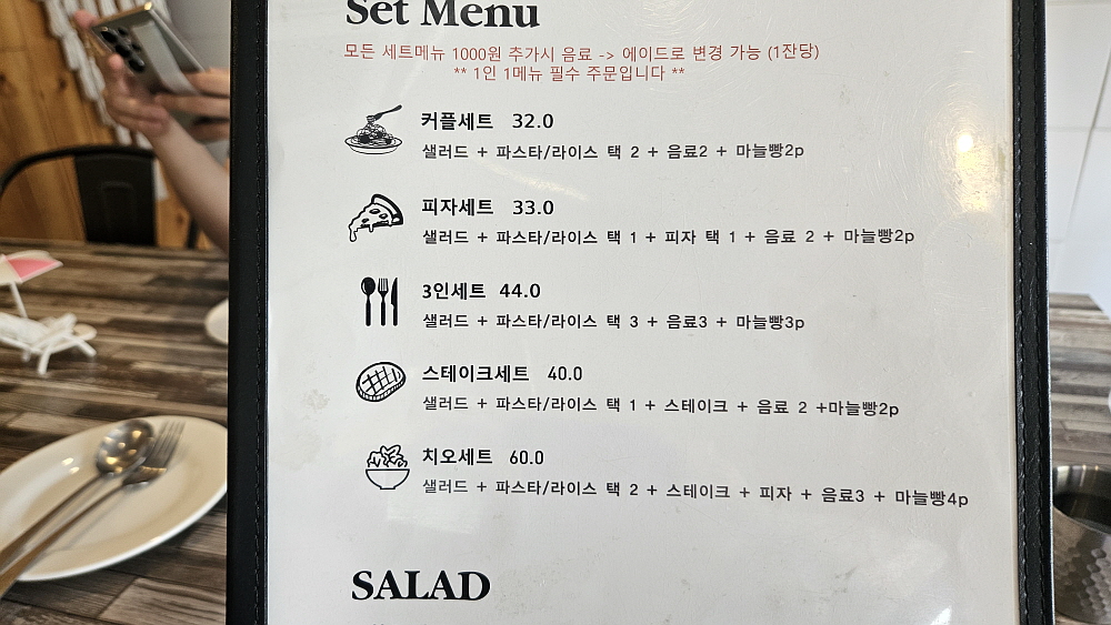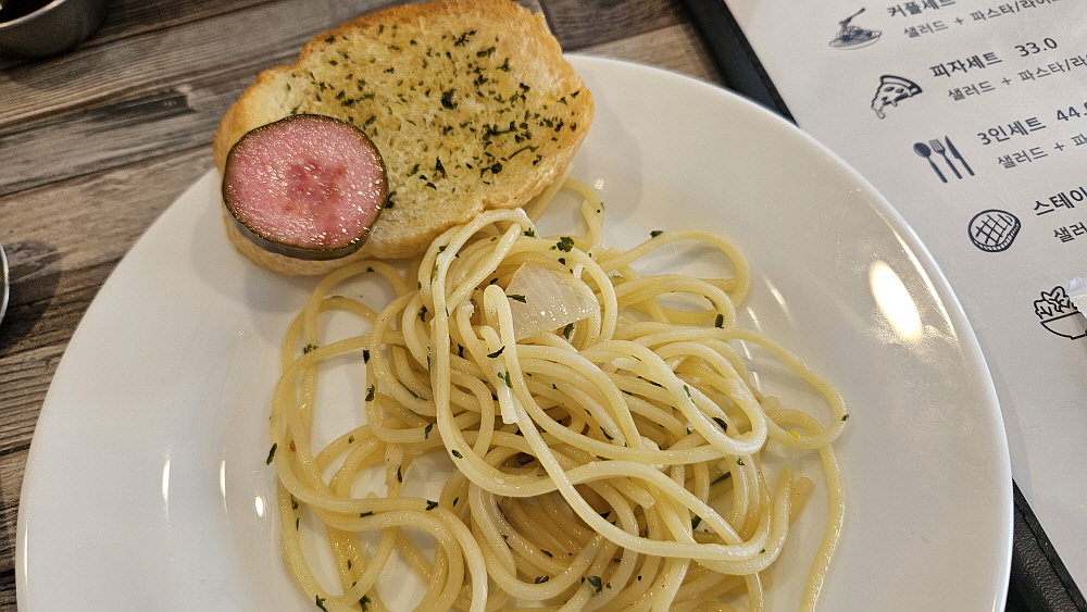 포천동 전화국 앞에 있는데 주차장이 따로 있는 것은 아니지만 휴일 근처는 한가한 편이었다. 우리는 네 명이니까 치오세트를 주문했다. 그러다 좀 부족하다 싶으면 단품으로 한 개를 더 주문할 생각이었다. 샐러드와 파스타 또는 라이스 중에 고르고, 스테이크와 피자 그리고 음료도 3잔이나 나온다. 처음 생각과 달리 막상 음식을 받고 보니 적은 양이 아니었다. 가성비는 그 어느 집보다 훌륭한 곳이다. 파스타는 알리오 올리오와 베이커 크림 파스타로 골랐고, 스테이크도 골랐다. 미리 주문해야 가자마자 먹을 수 있을 것 같아 그렇게 한 것인데 굳이 미리 주문하지 않아도 빨리 나오는 편인거 같았다.