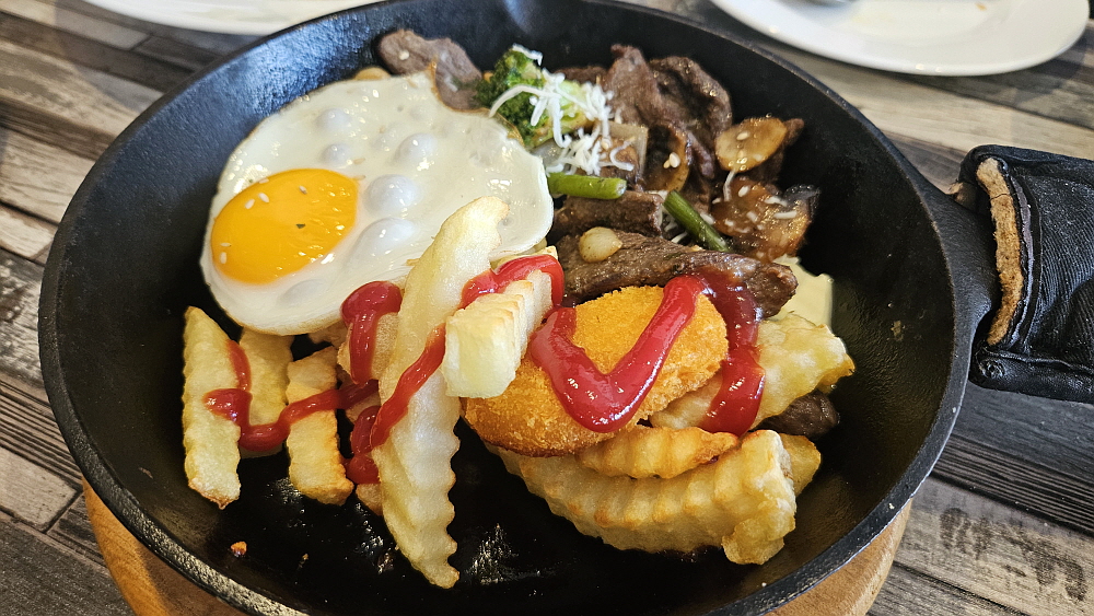 마지막은 등심 스테이크 였는데 생각해보니 주문할 때 스테이크를 어떻게 익히냐고 묻지 않았다. 그 말은 스테이크에 관하여는 아주 전문이라 보기는 좀 그렇다는 의미일 것이다. 웰던에 가깝게 익혀 나왔는데 조금 뻣뻣하다는 느낌이 들었고, 질긴감도 있었다. 결론적으로 보면 파스타는 수준급이고, 피자는 탑 급이고, 스테이크는 아쉽다고 할 수 있겠다. 그래도 가성비를 생각하면 나쁘지 않다. 스테이크는 감자튀김이나 계란 후라이 같은 다른 토핑같은 것들도 있는데 그래서 풍성한 느낌은 들었다. 스테이크 하나만 주문한 것이 아니기에 우리는 돌아가며 이것 저것 다 맛 볼 수 있어 좋았다.