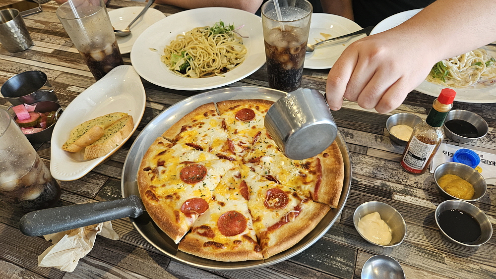 그래도 이집은 오일 파스타가 수준급이었다. 행운을 얻은 날이라 해야겠다. 마늘이 풍성하게 들어간 파스타로 오일의 풍미를 제대로 살려 놓았다. 함께 나온 마늘빵은 소소 였지만 피자는 아주 훌륭했다. 피자 만큼은 전문점 이상이었다. 다른 어느 메뉴보다 좋았다. 여긴 피자집이라 해도 될 것 같다. 그냥 피자만 두 어 판 먹으면 만족도가 높을 것 같은 느낌이었다. 도우도 맛나고 치즈도 듬뿍 들어간 것이 아주 만족스러웠다. 우리가 주문한 페퍼로니 피자만 그렇지는 않겠지... 다음에 기회가 된다면 다른 피자도 꼭 먹어보고 싶다. 오일파스타와 피자에서는 아주 만족스러웠다.