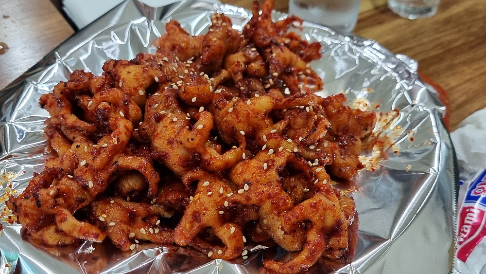 메뉴판을 보면 알 수 있지만 여기는 닭발 말고도 다른 아이템들이 있지만 모두 매운 맛의 음식뿐이다. 매운 것을 좋아하는 사람들의 성지같은 곳이라 하겠다. 먼저 가 있던 일행들이 불닭과 오돌뼈 주먹밥 세트를 주문해 놓았다. 온통 붉은 물결 속에서 과연 얼마나 매울지 걱정스런 마음도 있었다. 하지만 미리 가장 덜 매운 맛으로 주문을 했단다. 오돌뼈 주먹밥은 의외로 그렇게 맵지 않으면서 밥이 들어 있어서 먹는 식감도 괜찮았다. 닭발도 걱정할 정도로 매운 것은 아니었다. 하지만 역시나 매운 맛이 뒤 늦게 오는 집인가 보다. 서서히 매운 맛이 엄습해 오기 시작했다.