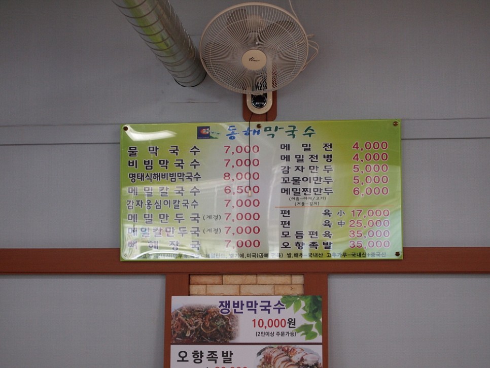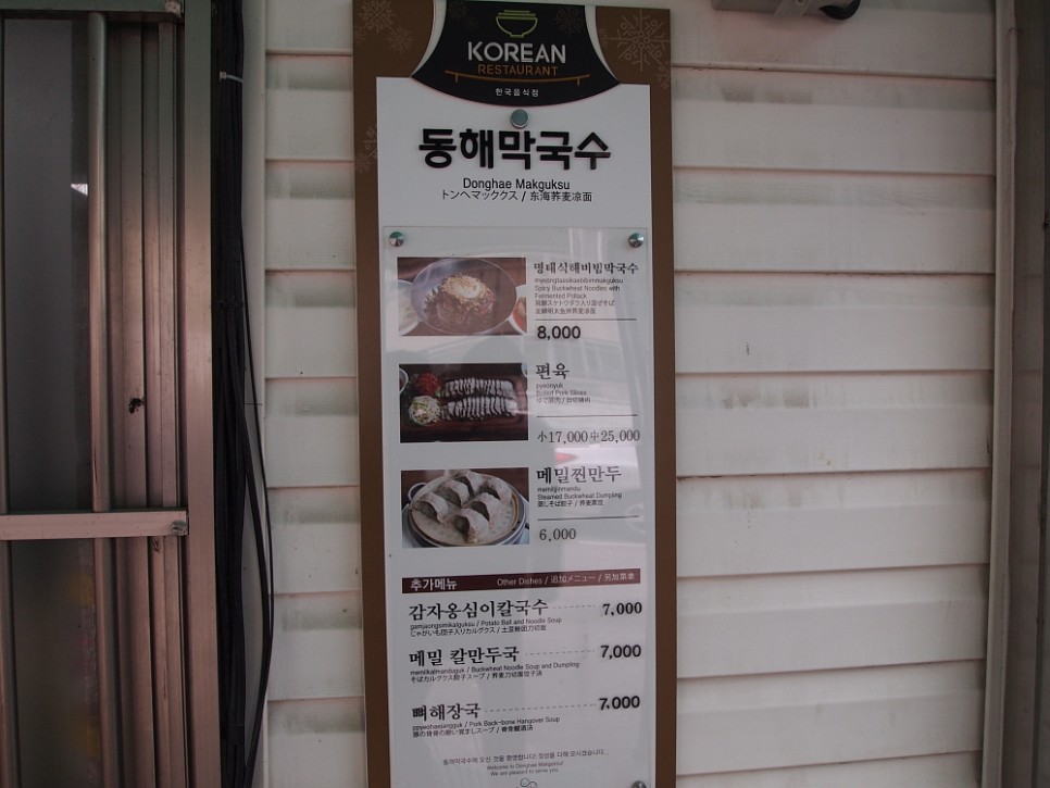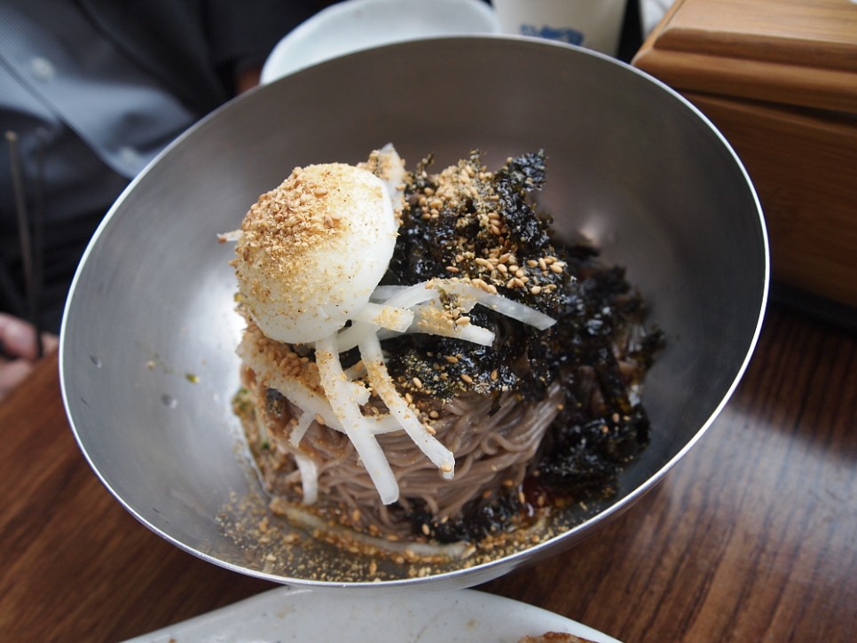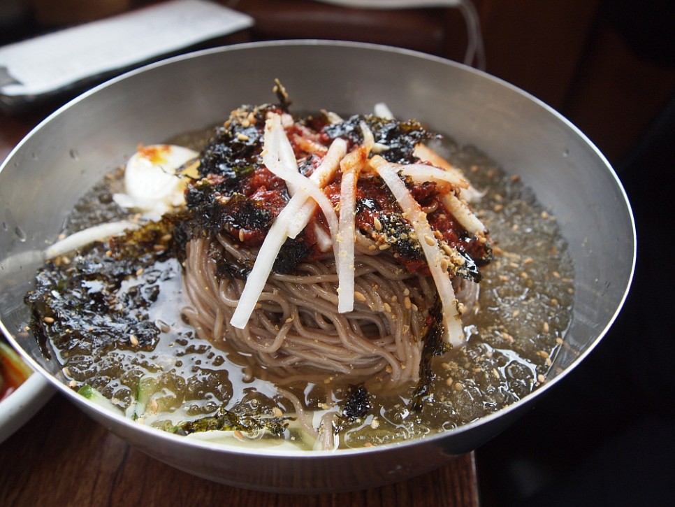 막국수 집이지만 특이하게 뼈 해장국도 팔고 있었다. 이건 무슨 조합이지? 아무튼 우리야 목표로 했던 막국수를 맛나게 먹으면 그만인 것이다. 여러 메뉴가 있다보니 사람들은 다양한 음식을 먹고 있었다. 물론 가장 많은 사람이 선택한 것은 막국수였다. 전체적으로 무난한 구성과 가격이었다. 한 번도 먹어 본 적 없는 명태식혜비빔막국수도 먹고 싶었는데 일단 이집의 가장 기본적인 막국수를 먹어봐야 평을 할 수 있을 것 같아 물 막국수와 비빔막국수로 주문했다.