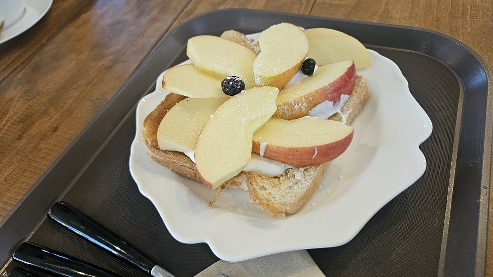 이집은 손님들에게 이런식으로 간단한 브런치를 만들어 제공한다고 했다. 빵 위에 크림바른 사과를 얹어 주었다. 사과는 맛있다는 포천사과라고 했다. 달달한 크림과 아식한 사과의 하모니가 꽤나 괜찮았다. 아마도 주인장이 사과와 무슨 관련이 있는 것인지도 모르겠다. 아무튼 쌉쌀한 커피와 달달한 브런치의 만남이 이색적인 것 같으면서도 잘 어울렸다. 우리가 할 수 있는 일들도 이런 경우가 많다. 잘 안 맞는 사람 같은데 같이 하다 보면 서로의 부족한 부분을 기가 막히게 잘 맞춰 주는 경우를 종종 본다. 그래서 어렵다는 세상살이 함께 할 수 있는 것이리라. 즐겁고, 맛난 하루였다.
