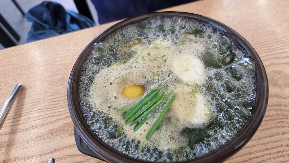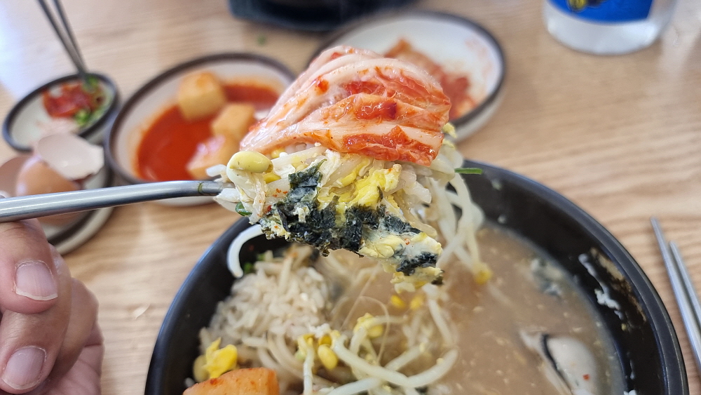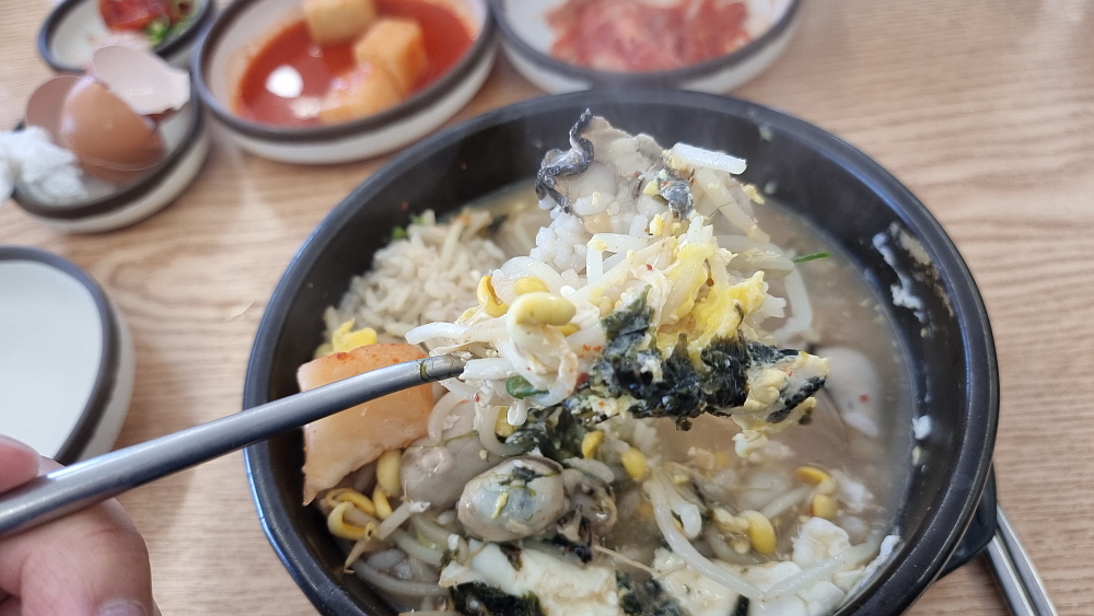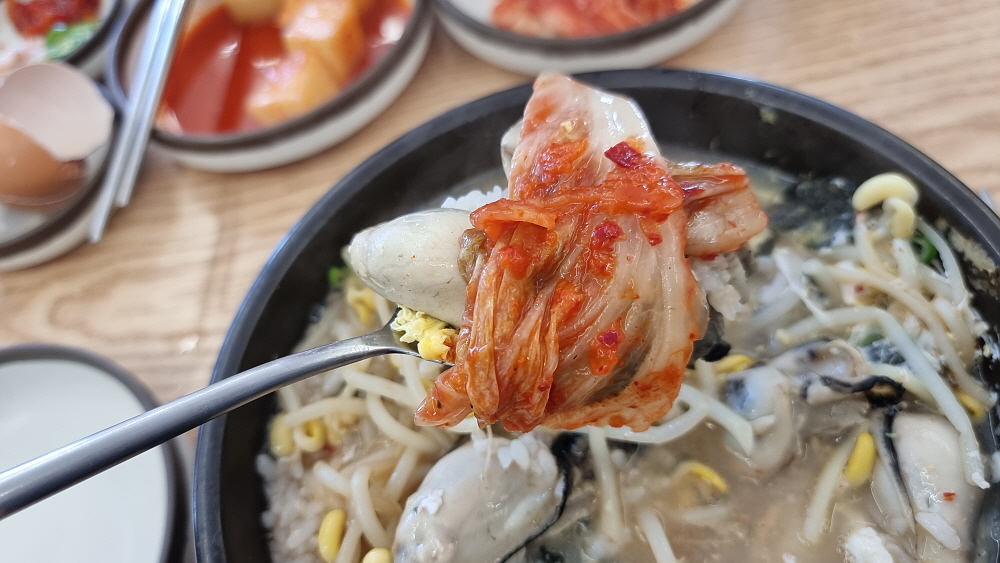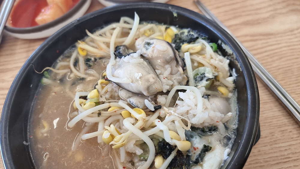 우리는 그렇게 개인적으로 좋아라 하는 굴국밥과 매생이 떡국으로 주문했다. 오리지널 콩나물 국밥에 굴을 넣은 아이템이 있는지 모르겠지만 언제부터인가 콩나물 국밥에 굴을 넣지 않으면 뭔가 허전하더라는... 굴이란 식재료가 계절을 많이 타는 것인지라 아마도 여기는 다른 굴 전문점처럼 잡자마자 냉동한 굴을 사용할 것이다. 아니라면 더운 여름에 상하기 쉬운 굴로 국밥을 만들기는 어렵다. 분명 냉동인것 같지만 신기할 정도로 굴의 식감과 향이 살아 있었다. 과연 이 정도라면 국밥이 아니라 그냥 해동하여 생굴로 초장을 찍어 먹어도 맛이 좋을 것 같았다.