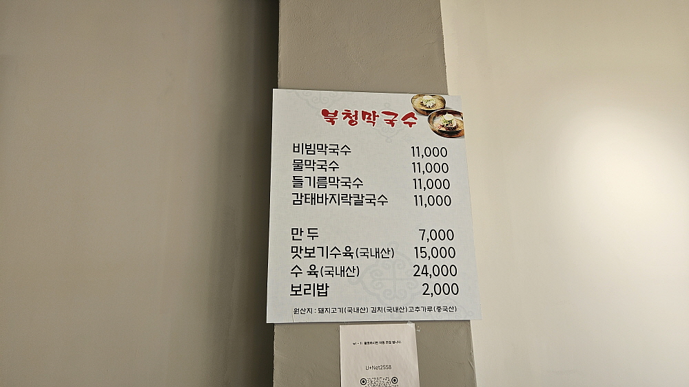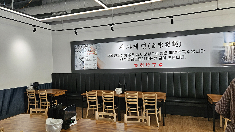 양주시 고암동, 그러니까 덕정역과 가까운 덕정고등학교 근처에 있는 '북청막국수'라는 곳이다. 분명 상호는 막국수 집이지만 여긴 감태 넣고 만든 바지락 칼국수가 또한 유명하다고 했다. 칼국수 선호자와 막국수라면 사족을 못 쓰는 사람이 손잡고 함께 갈 수 있는 곳이다. 토요일 오후 우린 이곳을 찾았다. 블로그 리뷰와 달리 그렇게 손님이 많아 보이지 않았다. 그래서 슬쩍 걱정스런 부분도 있었다. 과연 이렇게 한가한데 맛이 있는 곳일까? 하지만 일단 칼은 빼 들었으니 무라도 잘라 보자는 심정으로 우리는 감태 바지락 칼국수와 물 막국수를 주문했다. 넓직하고 깔끔한 식당의 실내는 무척 맘에 들었다.