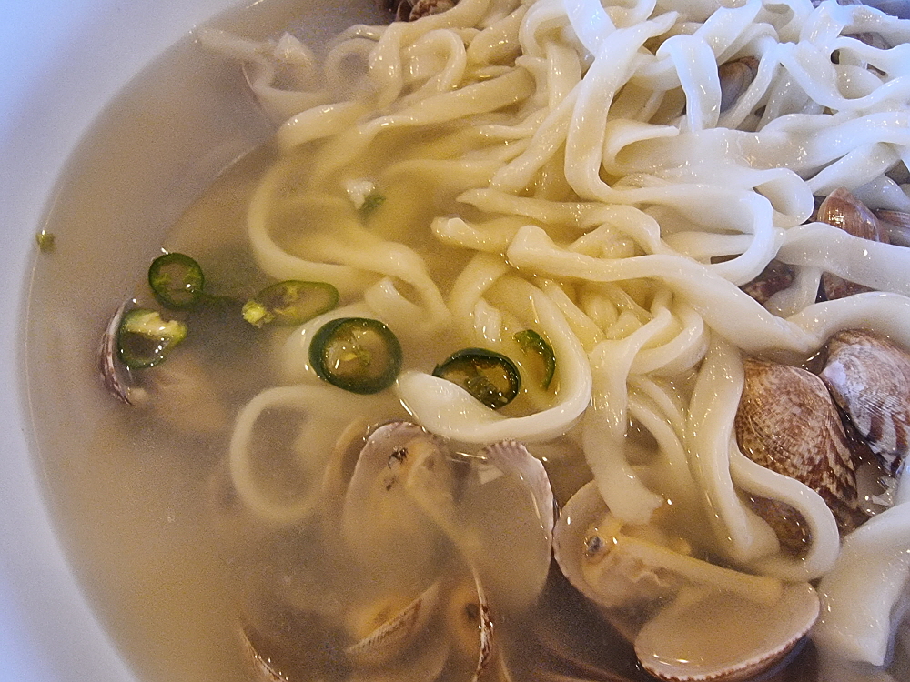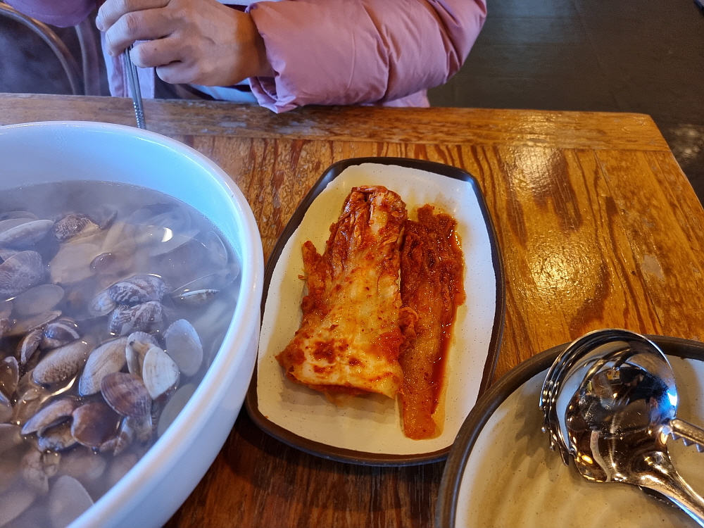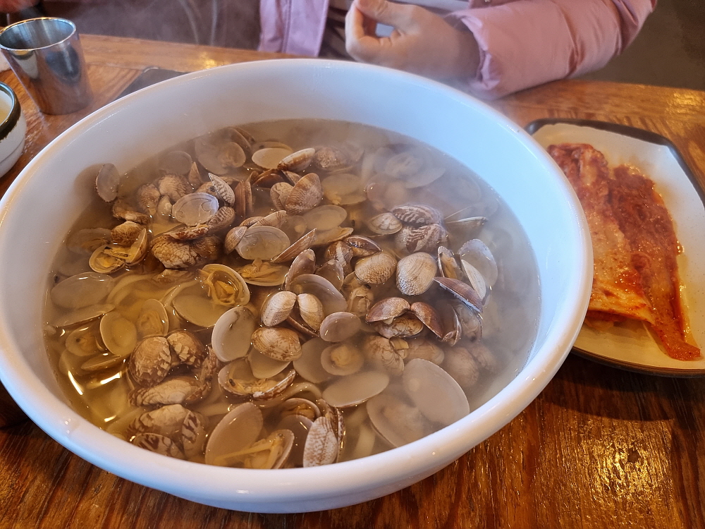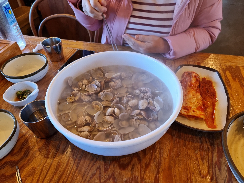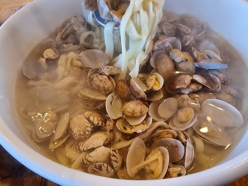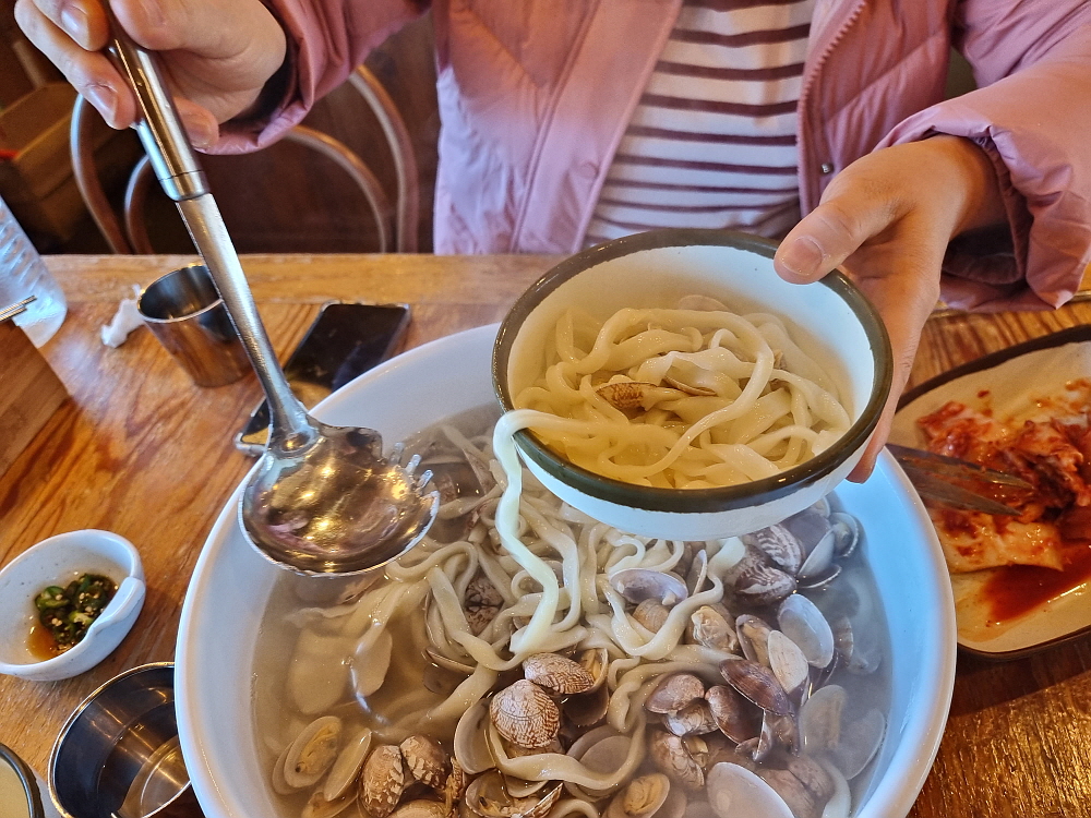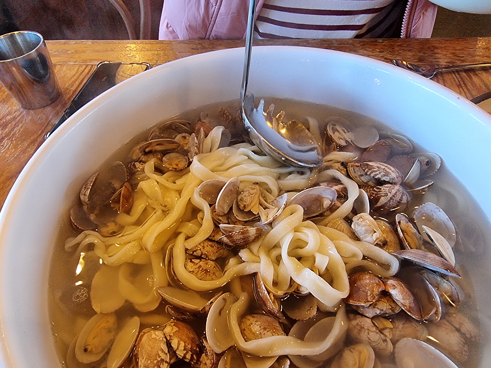 우리가 앉아 있는 자리에선 주방이 아주 훤이 들여다 보였는데 커다란 솥 세 개 정도에서 주방장으로 보이는 아저씨가 연신 면을 끓이고 바지락을 삶고 있었다. 바지락 칼국수를 그렇게나 많이 먹어봤지만 이렇게 만드는 모습을 가까이에서 보기는 처음이다. 다른 식당들도 이런 방식으로 끓이는지 잘 모르겠지만 여긴 면과 바지락이 따로 삶아지고 있었고, 나중에 합치는 방식이었다. 어쨌든 바지락은 정말 많이 들어 있었다. 하지만 철이 아니라 그렇지 씨알이 굵지는 않았다. 그냥 작은 조개들이었다.