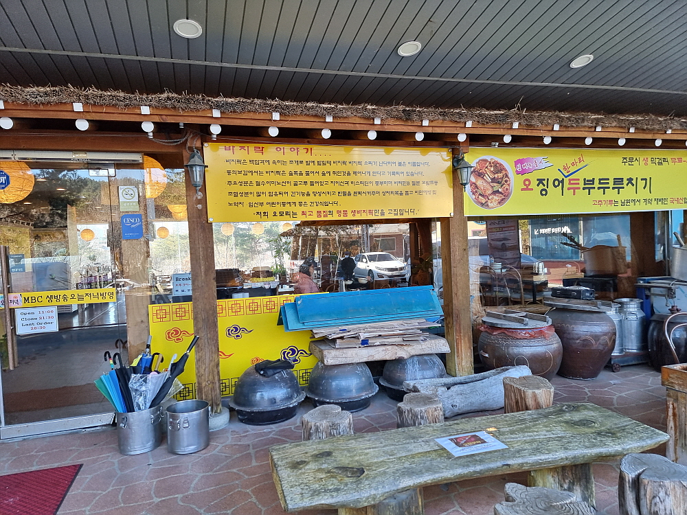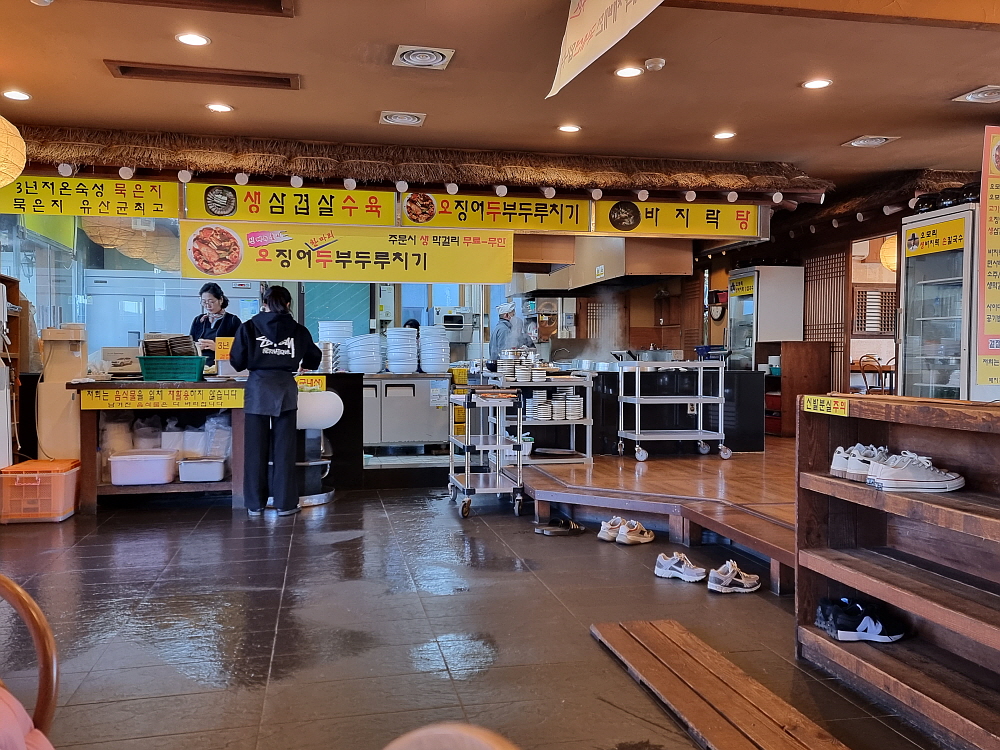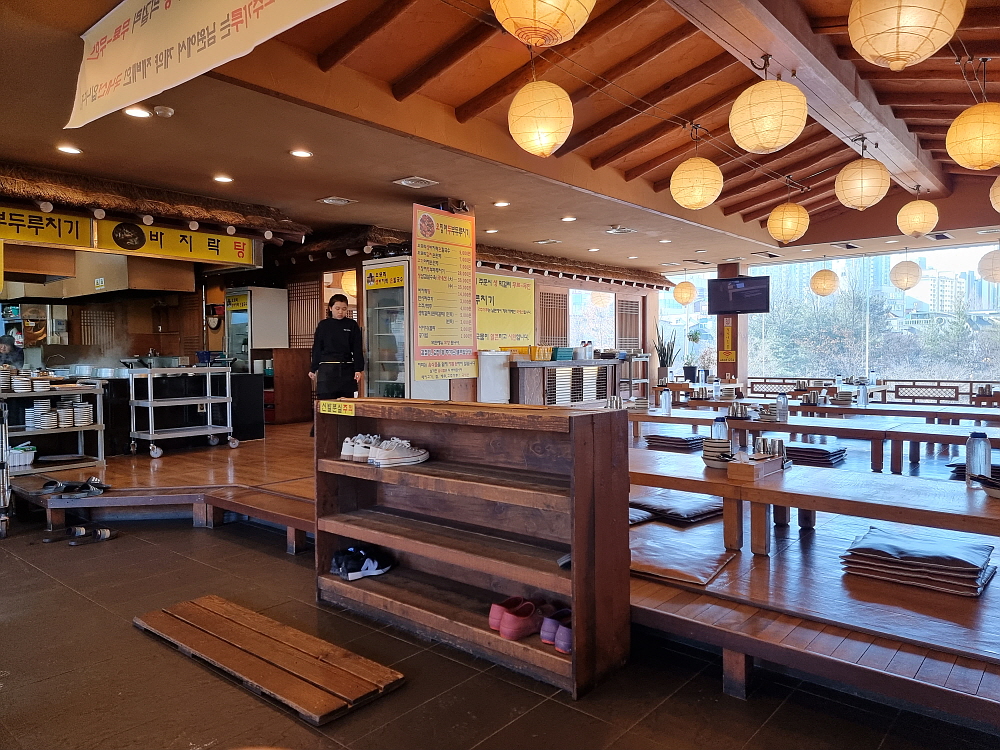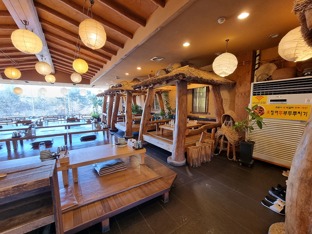 우리는 가게의 오픈시간에 맞춰 10분 주차장에 도착하여 문을 열기를 기다렸다. 블로그 들을 보면 주말엔 웨이팅도 좀 있다 하니 선두를 뺏기지 않으려고 노력한 결과다. 그렇게 식당 문 열기가 무섭게 1착으로 들어가서 바지락 칼국수 2인분을 주문했다. 주문을 마치고 나서야 식당 안을 찬찬히 살펴 볼 수 있었다. 가게의 인테리어가 매우 특이했는데 의자에 앉는 테이블이 조금 있고, 대부분 가운데 좌식 테이블이 있었고, 오르쪽 벽쪽으로는 원두막 같은 인테리어를 한 좌식 테이블도 있었다. 이건 무슨 의미의 자리지?