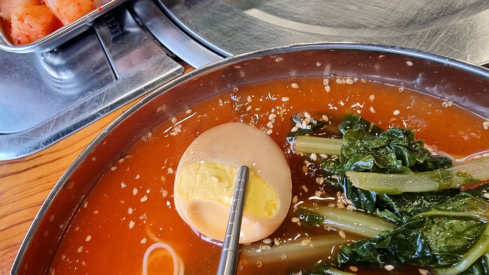 그리고 얼음이 동동 떠있는 열무김치국수 역시 여름의 단골메뉴이다. 이집은 특이하게 열무김치국수에 고명으로 군 달걀을 주었다. 보통은 찐 것으로 주는데 말이다. 군 달걀의 조금은 단단한 식감이 싫은 사람에겐 조금 생경할 고명이다. 열무김치는 아주 잘 익은 것으로 했다. 시큼하면서 달달하고, 시원한 김치는 그 자체로 반찬이 될 정도로 괜찮았다. 거기에 역시 조금 달달한 국물을 넣으니 몸도 시원하고 마음도 시원해지는 기분이었다. 열무김치국수는 역시 김치가 맛좋아야 한다. 그런 점에서 본다면 이집의 열무김치는 최근에 먹어 본 김치 중에 갑이라 하겠다.
