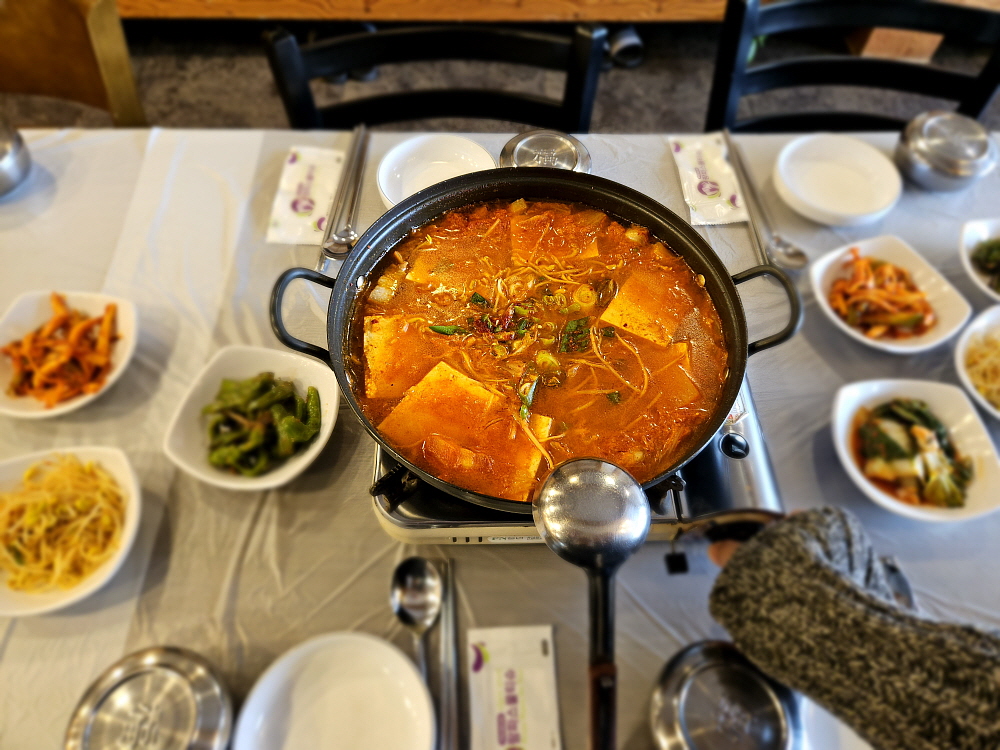 헌데 사실은 이 메뉴가 김치찌개라는 것을 듣지 못했다면 누구라도 두부전골이라 생각했을 것이다. 비주얼은 김치찌개보다는 그쪽이 더 가깝게 보였다. 김치찌개라지만 커다란 두부가 거의 냄비를 덮고 있었다. 푸짐하다. 내가 값을 지불하는 것도 아니라 일인분에 얼마인지 묻지 못했다. 아무리 얻어 먹는 처지라도 얼마인지 물어 볼 것을 그랬나? 정갈한 반찬 몇 가지가 놓이고, 갓 지은 쌀밥도 대령했다. 간단한 듯 하지만 푸짐하고 정성이 들어간 우리의 점심식사가 마련된 것이다. 김치만 맛나다면 김치찌개야 뭘 넣고 끓여도 항상 맛이 좋은 법이다.