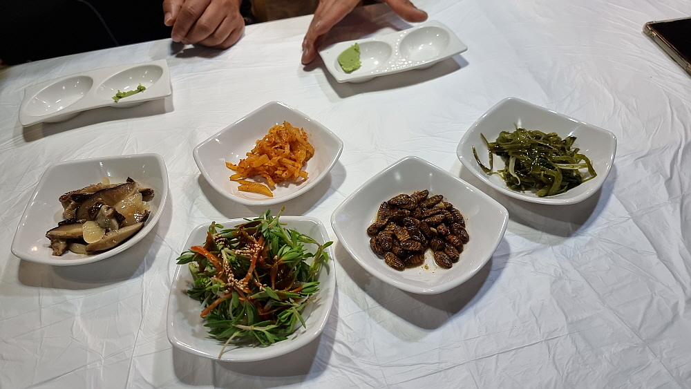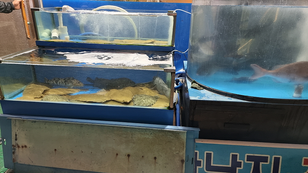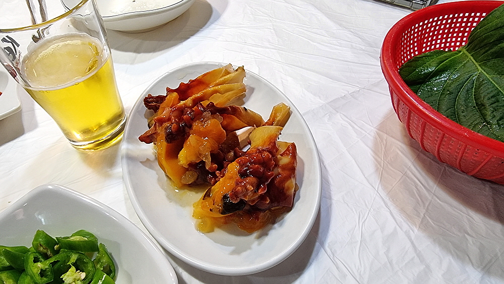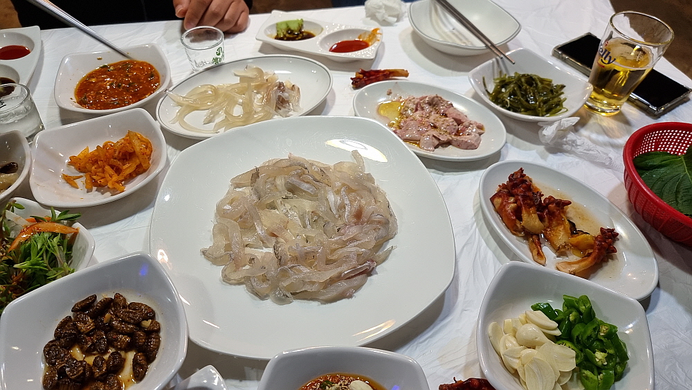 우리는 요즘 몸값이 올라 귀하다는 오징어와 생선회 중에 민어회를 조금 주문했다. 민어를 회로 먹은 적이 있던가 싶을 정도로 생소한 생선이다. 이집에서 먹어 보게 되었다. 기본 반찬은 다른 횟집들과 크게 다르지 않다. 다소 생소한 것은 아귀간인가를 주었다는 것이다. 이것도 생소한 음식이다. 이런 반찬을 주는 집은 별로 없는 것 같다. 애들이 좋아하는 콘치즈 같은 반찬은 없다. 그러니까 여기는 아재들의 식당인 것이다. 애들은 별로 오지 않을 곳이다. 그런 점이 또한 맘에 든다. 다소 어수선한 분위기이긴 하지만 전문가의 포스는 물씬하다.