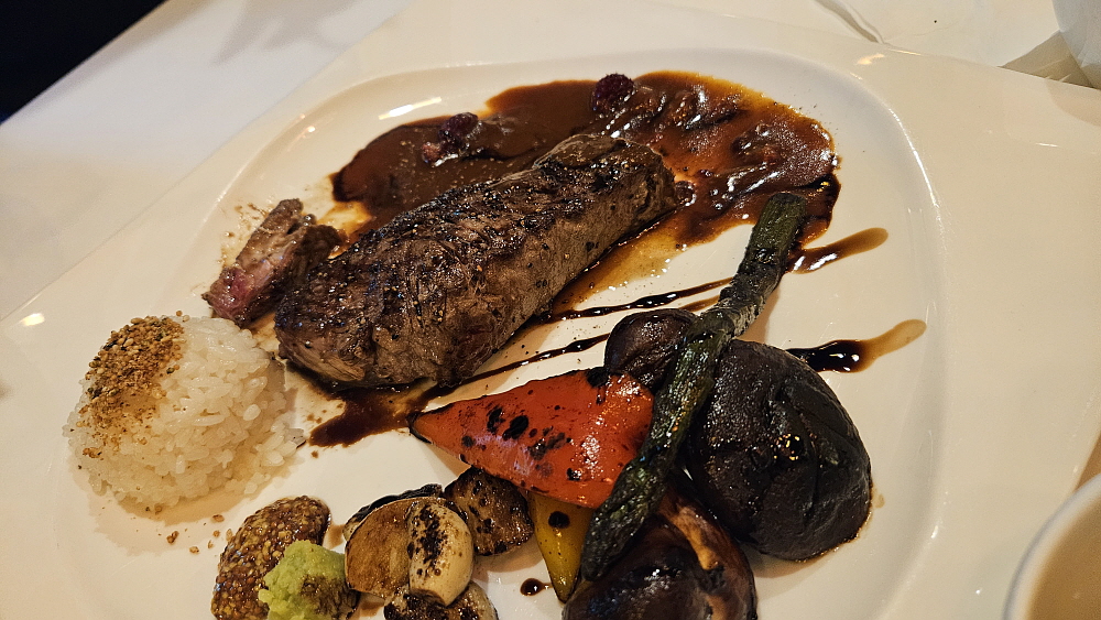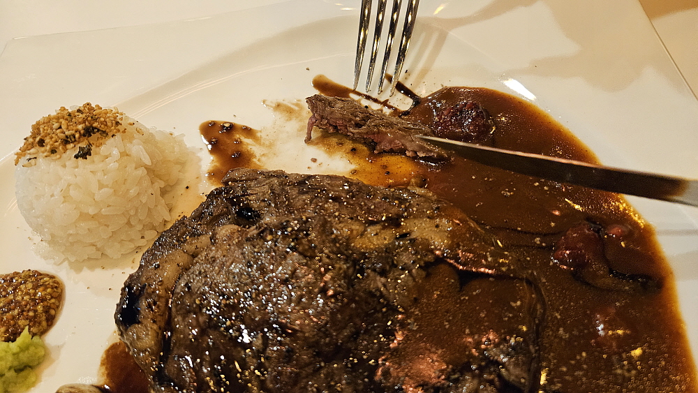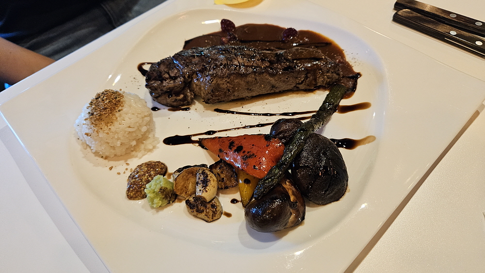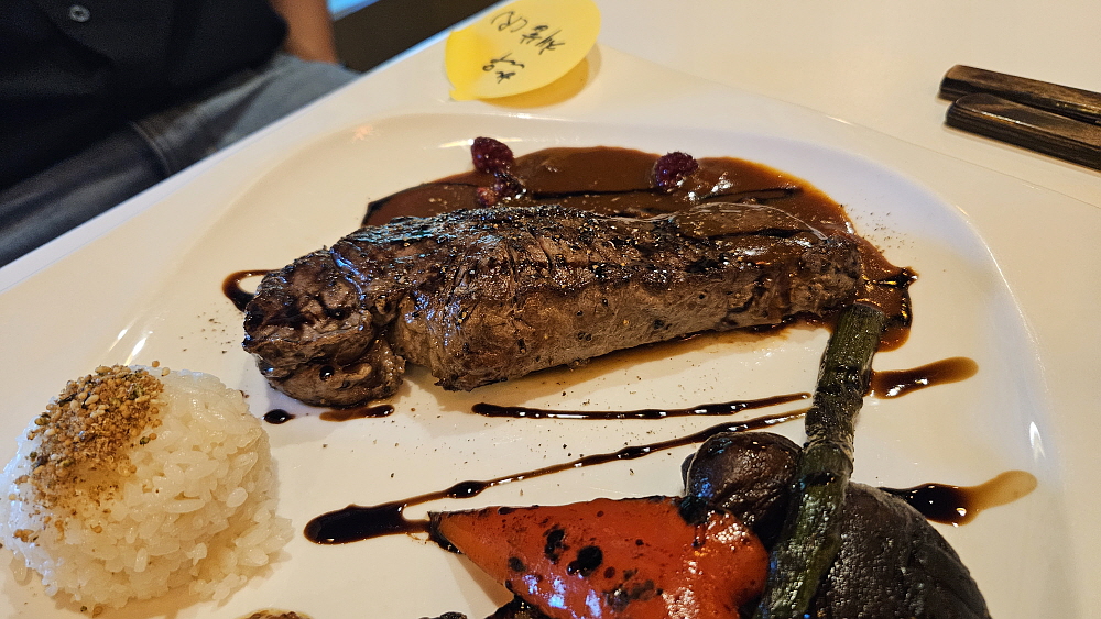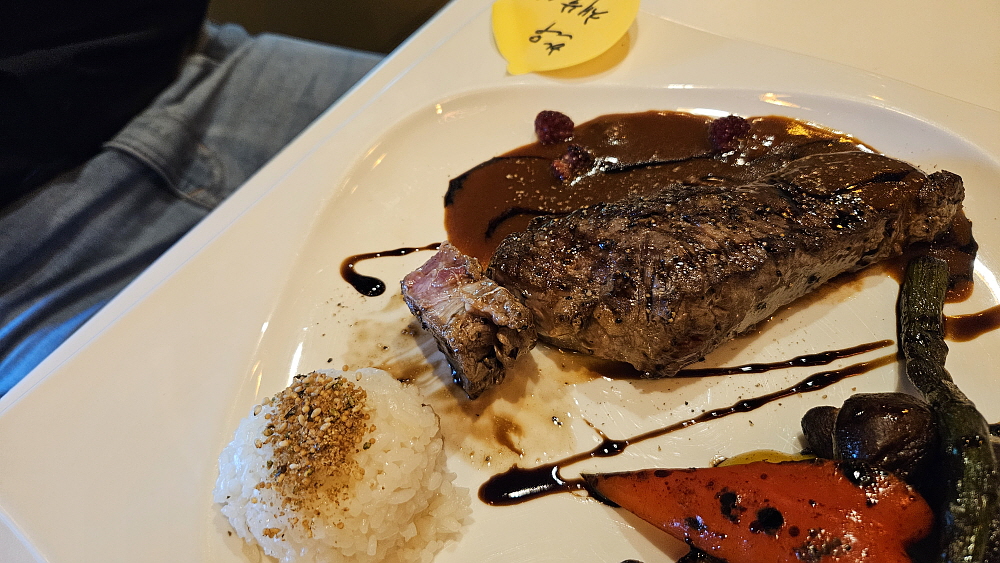 주인장 내외로 보이는 두 사람이 일하기 때문에 음식은 로봇이 가지고 왔다. 그런데 다른 식당에서는 보지 못했던 광경이었다. 로봇에서 음악이 흘러 나왔다. 동요 비슷한 것이었다고 기억하는데 실내가 아주 넓은 것이 아니기 때문에 손님들이 로봇과 부딪치는 것을 막기 위함인 것 같았다. 아무튼 재미있었다. 로봇이 날라다 준 스프를 먼저 먹었다. 이런 에피타이저는 경양식이 유행했던 과거부터 있었던 것 아니던가... 가장 먼저 채끝 스테이크와 등심 스테이크가 나왔다. 밥이 앙증맞게 조금 있고, 플레이팅이 제대로 된 스테이크가 접시에 담겨 있었다. 참 잘도 만들었다.