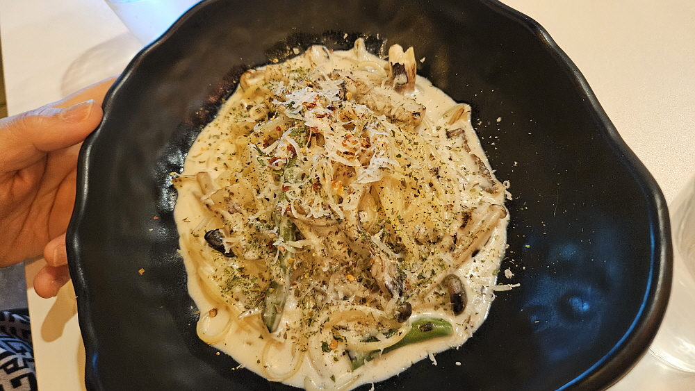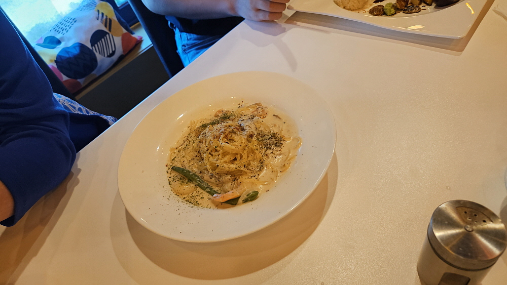 크림파스타와 샐러드도 나왔다. 버섯이 들어간 크림 파스타가 특히 맛이 좋았는데 어떻게 만든 것인지 몰라도 버섯 향이 엄청 강하게 났다. 원래 버섯은 향이 은은하게 나지 않던가? 어떻게 이렇게 진한 버섯의 풍미가 나오는지 신기했다. 파스타의 양이 결코 적은 것이 아니었다. 이 정도면 성인 남성도 든든하다 할 정도였다. 오일 파스타는 가격도 싸고 만드는 것도 힘들어 보이지 않지만 사실 조리하기 참 까다로운 음식이다. 오일로만 맛을 낸다는 것이 쉬운 일이 아니기 때문이다. 거기에 적당한 풍미와 식감도 살아 있어야 한다. 즉, 면이 알단테로 제대로 삶아져야 한다. 그런 조건이 거의 맞았다. 맛이 좋다는 뜻이다.