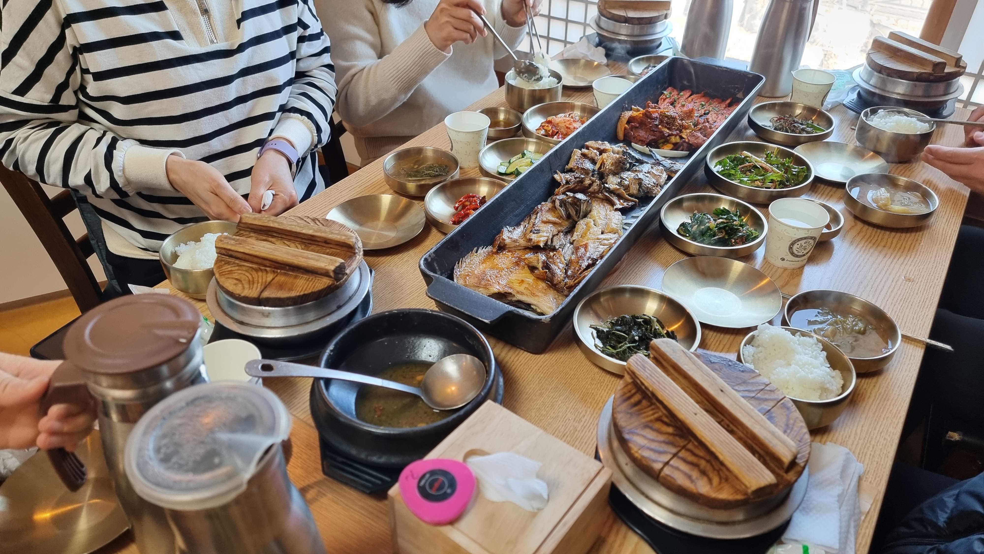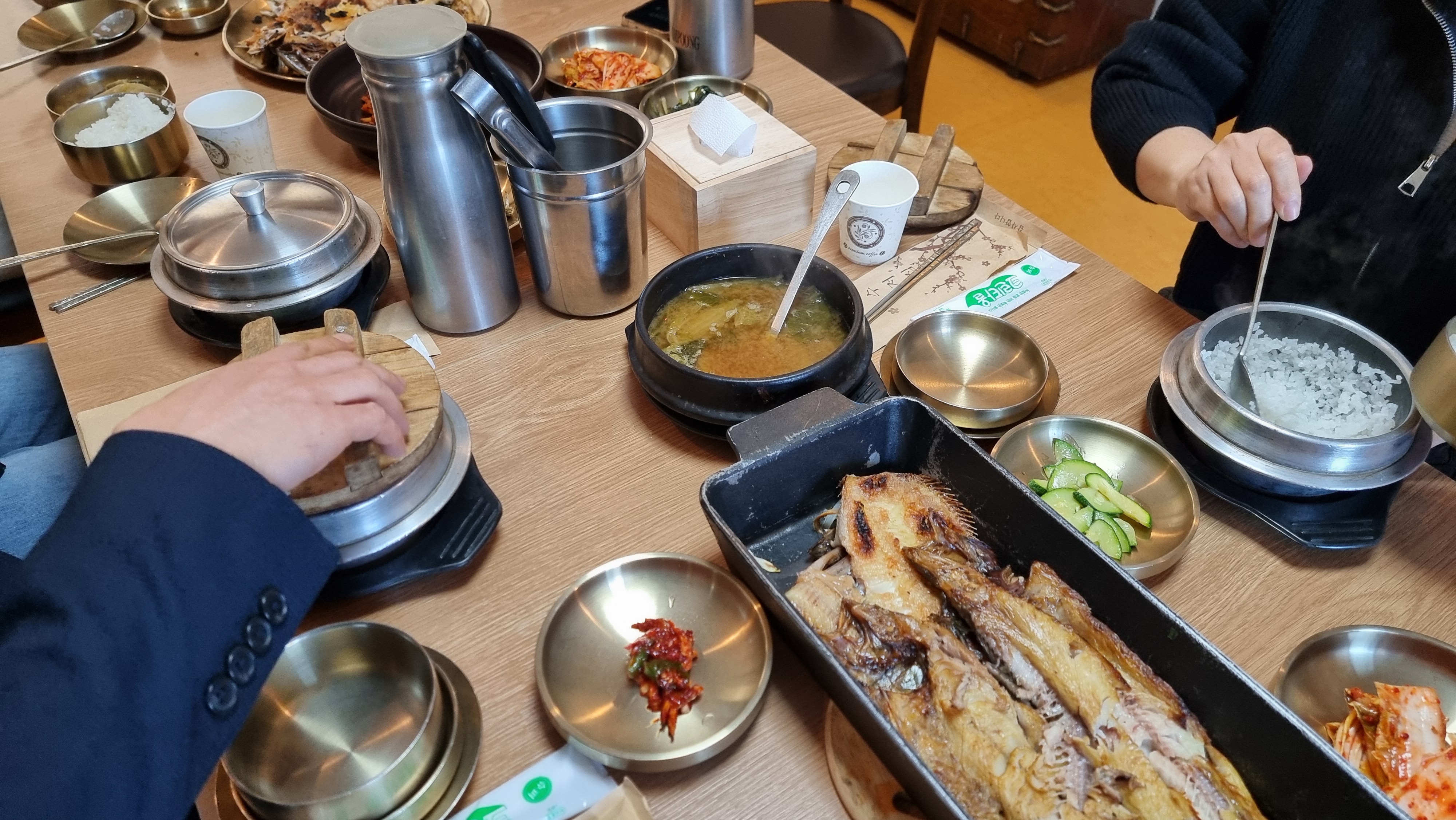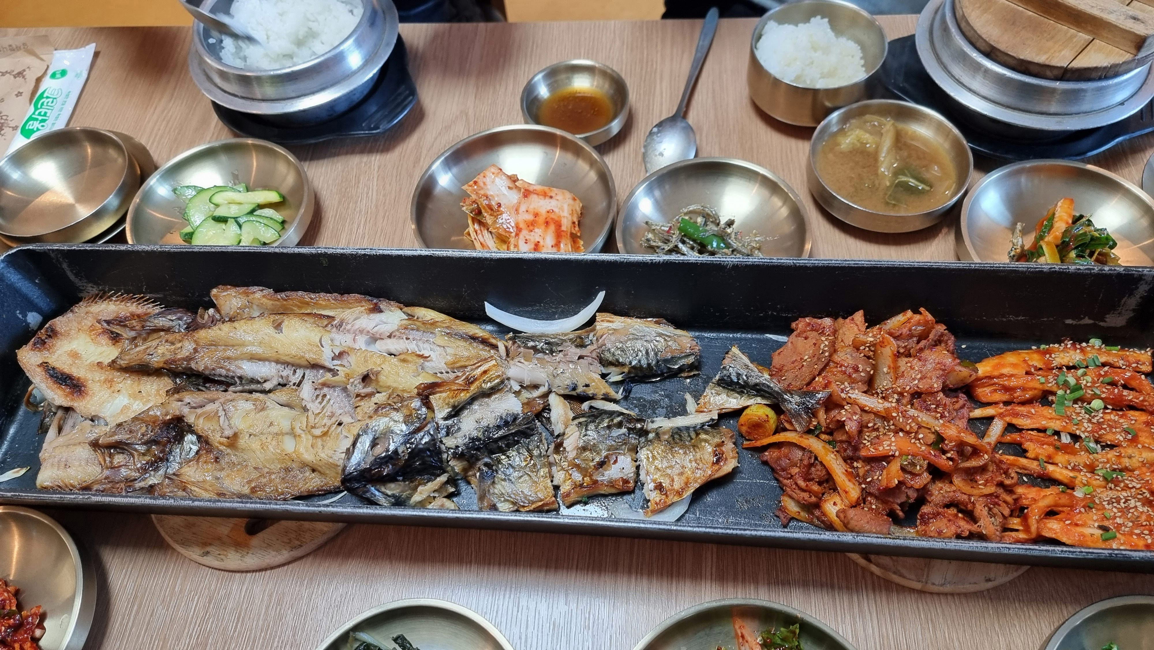 미리 예약을 해 둔 배려 덕분에 우리는 들어가자 마자 바로 식사를 할 수 있었다. 특이하게 생긴 팬 속에 생선을 넣어 굽는 모양이었다. 거기엔 생선만 있는 것이 아니라 제육볶음과 더덕구이도 있었다. 벌써 보기만 해도 입안에 침이 고이는 비주얼이었다. 생선도 먹기 좋게 미리 어느 정도는 절단을 해 놓은 상태였다. 이제 정말 앉아서 숟가락 들고 먹기만 하면 되는 것이다. 워낙 이천쌀에 대한 이야기를 많이 들은터라 과연 제대로 된 솥밥으로 갓지은 이천쌀밥이 어떨지 궁금했다. 약간의 밑반찬도 있어 여기가 백반집이라는 사실을 다시 한 번 알게 해 주었다.
