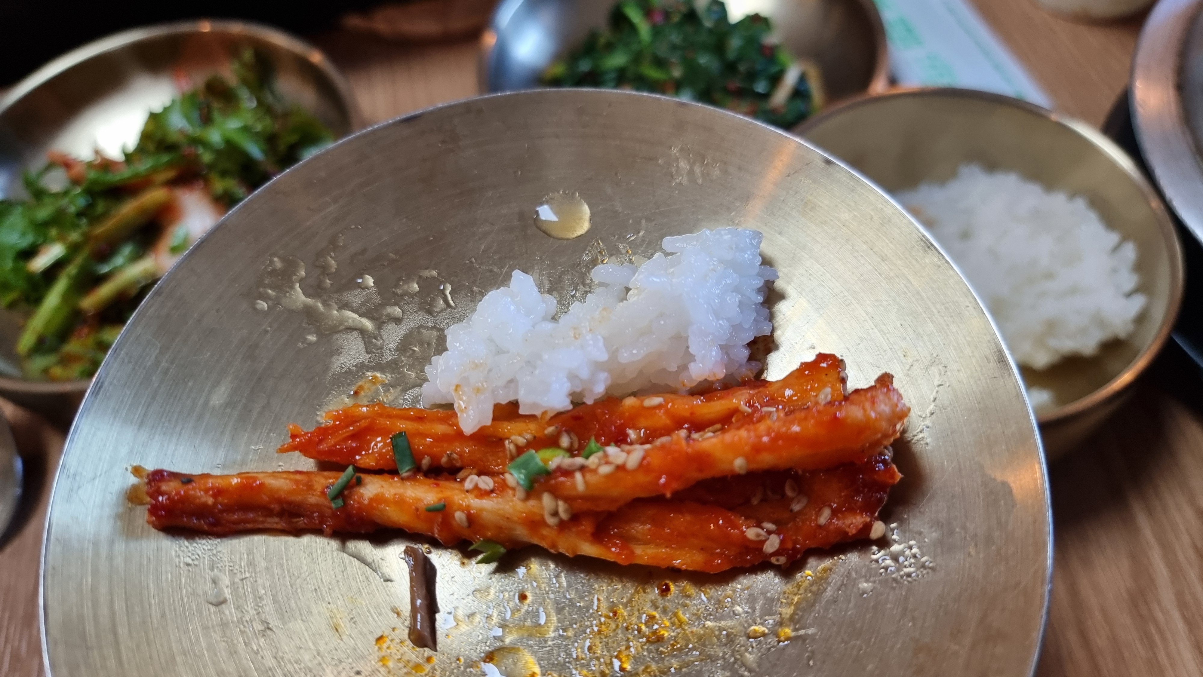 고슬고슬하면서 부드럽고, 달면서 찰진 이천의 쌀밥은 정말 훌륭했다. 왜 사람들이 이천의 쌀밥을 칭송하는지 알 것 같았다. 잘 지은 밥을 떠내고 누룽지를 만들기 위해 솥에 물을 부어두는 것을 잊지 않았다. 자극적이지 않은 이집의 반찬과 생선구이는 제대로 쌀밥의 조연 역할을 하고 있었다. 반찬의 간이 세다면 아마도 이천의 쌀을 제대로 음미하지 못했을 것이다. 조선시대 양반의 밥상이라 해도 부족함이 없는 거한 한 상이다. 이렇게 밥을 먹으면 왕후장상이 부럽지 않을 것이다. 반찬들도 그렇게 약간은 고전적인 느낌이 드는 것들이었다.