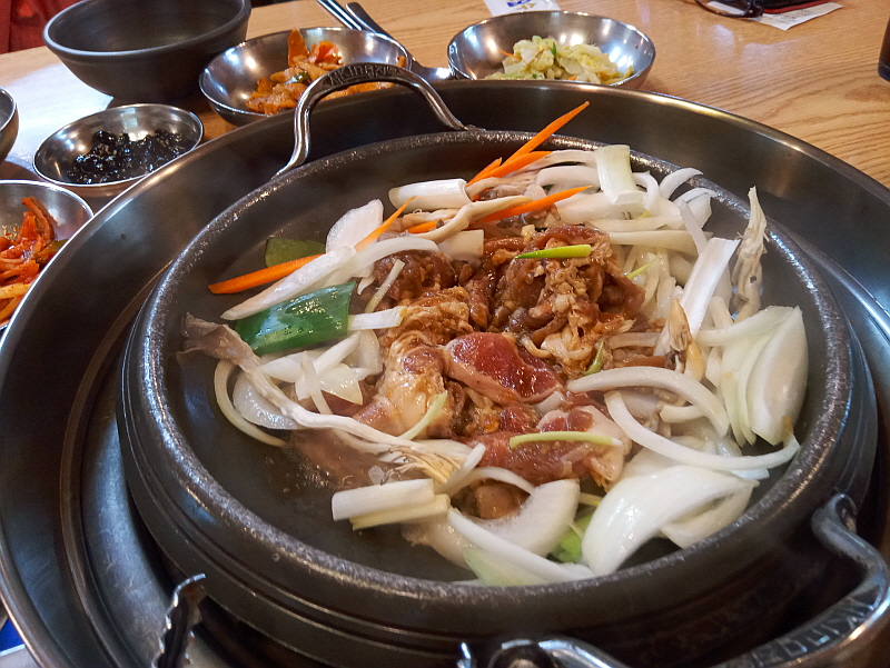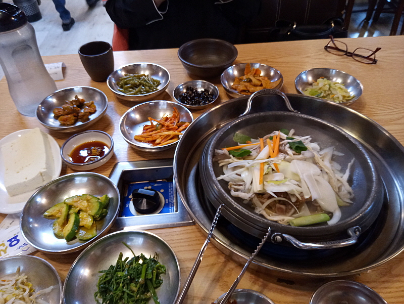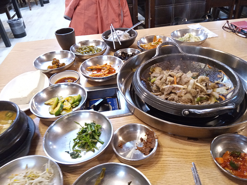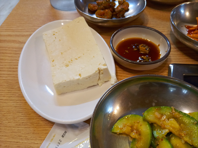 많은 가짓수의 반찬이 나오는데 하나같이 손이 많이 가는 집밥 반찬들이었다. 이 집은 이런 정성으로 승부를 거는구나 싶었다. 거기에 달달한 간장 양념이 듬뿍인 돼지고기는 아마도 다리살 같았다. 전문가들이 삼겹살 보다 돼지는 다리살을 먹는 것이 건강에 좋다고들 하는데 어디 우리네 정서가 그런가? 암튼 삼겹살을 그닥 즐기지 않는 나는 만족스러웠다. 특히 맘에 든 것은 커다란 모두부를 하나 내어 주는 것인데 배가 불러 남길 정도로 그 크기가 장난이 아니었다. 저 정도 두부면 그냥 두부김치로 안주삼아 술 한 잔 해도 될 정도였다. 내가 평소 그렇게나 좋아하는 다양한 나물과 김치를 맘껏 먹을 수 있으니 이미 나의 만족은 충만했다고 하겠다.