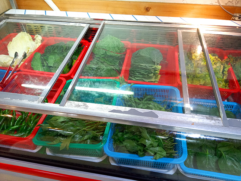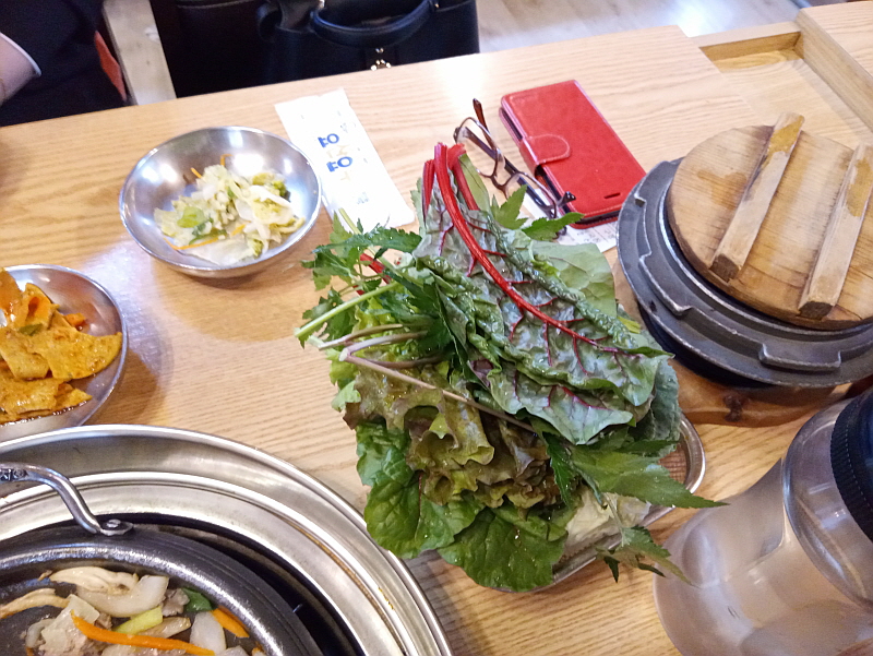 꽤나 넓은 식당 안에 가득한 손님들 모두 쌈싸먹는데 심취해 있었다. 쌈 채소를 유난히 좋아하는 마눌과 그래도 매니아라 할 수 있는 나는 이런 집이 참 고맙다. 아마 우리가 이날 리필해 먹는 쌈 채소는 싯가로 2만 원 어치는 넘을 것 같다. 서 너 번을 족히 왔다 갔다 하면서 쌈 채소를 싣어 날랐다. 우리가 주문한 것은 돌솥쌈밥 간장 양념 제육이었다. 매운 것에 취약한 나의 먹기 능력을 반영한 주문이었다. 이집에서 또 하나 특이한 것은 김치는 손님이 직접 갖다 먹는 방식이라는 것이다. 요즘처럼 열무김치 값이 비쌀 때는 이런 영업정책이 불리할 수도 있을 텐데 이집은 그 방식을 고수했다. 역시나 우린 열심히 김치를 퍼다 날랐다. 이러니 우리가 먹은 김치값도 적지 않을 것이다.