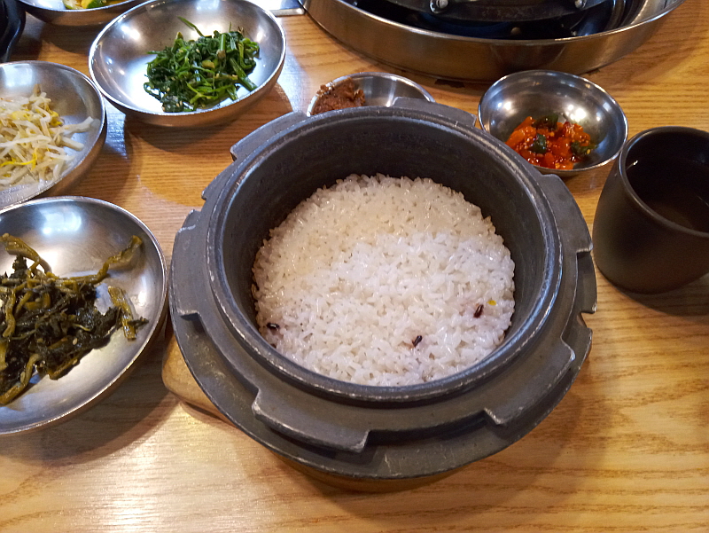 숭늉을 먹으려고 일부러 시키는 돌솥밥도 참 먹음직했다. 엄밀히 말하면 여긴 돌솥밥이라기 보다는 무쇠솥밥이라는 표현이 맞을 것이다. 아무튼 쌀의 맛을 극대화 시켜주는 영양 밥임에 틀림없다. 우리네 한국 사람들, 밥하면 하얀 쌀밥에 맛난 반찬으로 푹푹 퍼 먹는 것이 가장 이상적인 식사 아니던가? 무쇠솥밥의 밥을 덜어 내 다양한 쌈 채소에 싸먹는 맛은 이런 맛을 좋아하는 사람이라면 누구나 몸서리 쳐 질 정도로 맛난 것이다. 이런 밥상이라면 굳이 고기가 없어도 된다. 맛이 진한 쌈장에 마늘 몇 조각만 있어도 그 맛이 정말 강렬하다.