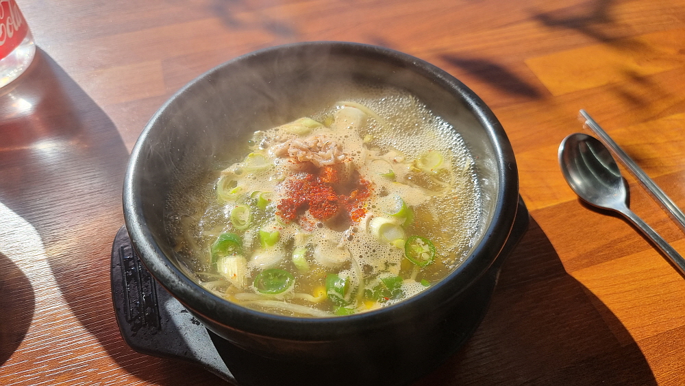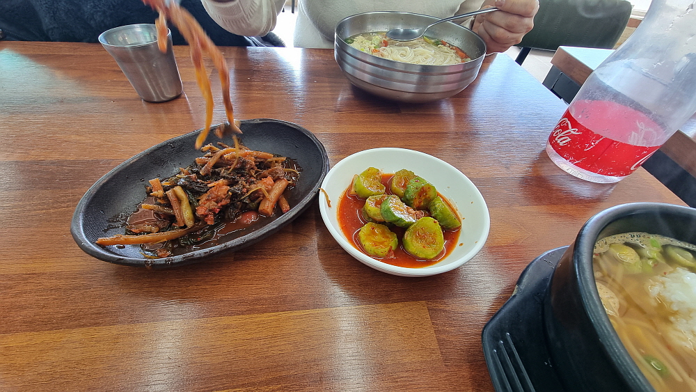 반찬들 역시 담백 자체였는데 주방이며 서빙을 혼자하는 주인장이 평소 잔뜩 반찬을 만들어 놓는 것 같았다. 평소와 달리 우리는 반찬을 많이 먹었다. 콩나물이 워낙 담백한 탓에 밥을 말아 먹을 때 김치가 없으며 심심할 정도였다. 밖이 훤히 내다보이는 통창으로 겨울 햇살이 따갑게 내리 쬐는 것이 이젠 정말 올해 겨울 추위는 다 지나간 모양이다. 올 겨울처럼 혹독한 시기도 별로 없을 것이다. 눈도 많이 오고 말이다. 아는 사람 집에서 한 끼 먹는 기분으로 우리도 아주 맘 편하게 밥을 먹었다. 식당에서 사먹는 밥이란 생각이 거의 들지 않았다.