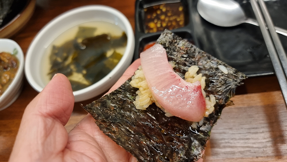 푸딩처럼 부드러운 계란찜도 인상적이었다. 너무 부드러워 이런 계란찜이 있을까 할 정도였다. 그리고 이집은 특이하게 초밥을 손님이 직접 만들어 먹으라고 밥과 묵은지, 무순과 락교와 생강절임을 내어 준다. 김에 이런 재료들을 넣고 방어까지 함께 싸서 먹는 것이다. 일종의 김쌈인데 와사비와 함께 먹으면 맛이 일품이다. 다른 곳에선 먹기 힘든 레시피라 손님들은 저마다 각자의 김쌈을 싸 먹느라 정신이 없었다. 우리뿐 아니라 대부분의 테이블에서 방어를 먹었다. 역시 기름이 흐를 것처럼 넘치는 방어의 자태가 아주 고왔다.