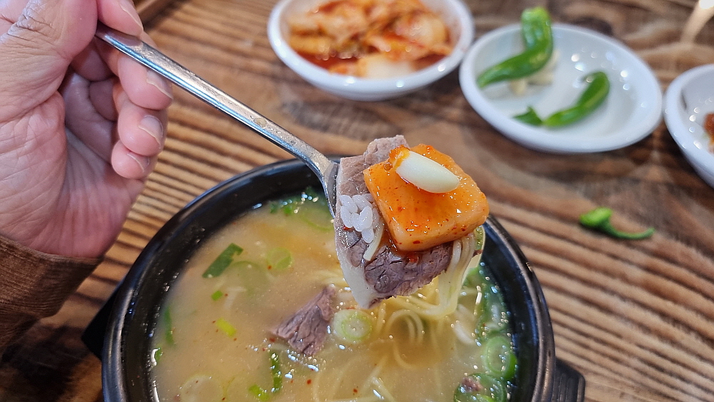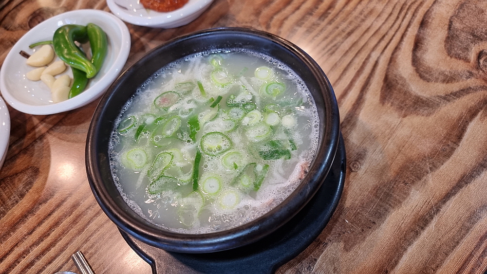 메뉴판에는 특이하게 곰탕과 설렁탕이 모두 선택 가능했다. 보통 곰탕이면 곰탕, 설렁탕이면 설렁탕 이렇게 한 가지 메뉴에 집중하게 마련인데 여긴 그냥 대놓고 두 가지를 모두 판다. 곰탕과 설렁탕의 차이가 무엇인지 손님이 먹어보고 직접 판단하라는 의미같았다. 그래서 우린 둘 다 주문했다. 아는 상식으로 곰탕은 양반들이 주로 먹었던 국물로 뼈를 사용하지 않고, 고기로만 국물을 내서 담백하고 맑은 국물이요, 설렁탕은 고기와 함께 소뼈를 함께 삶아 국물이 뽀얗면서 진한 것이 특징이라는 차이가 있다. 정답인지 모르겠지만 우리가 광안리 서울깍두기에서의 곰탕과 설렁탕은 큰 차이를 느끼지 못했다는거...