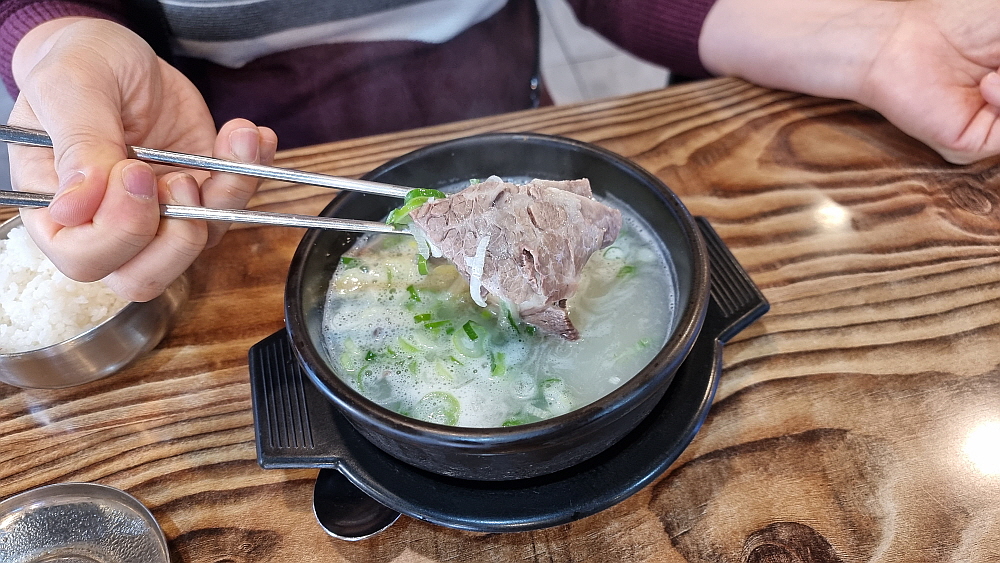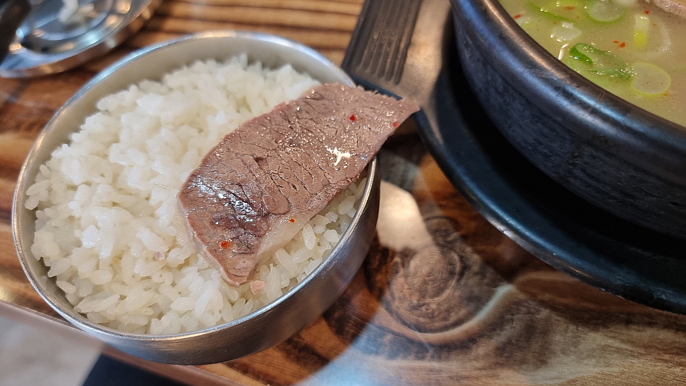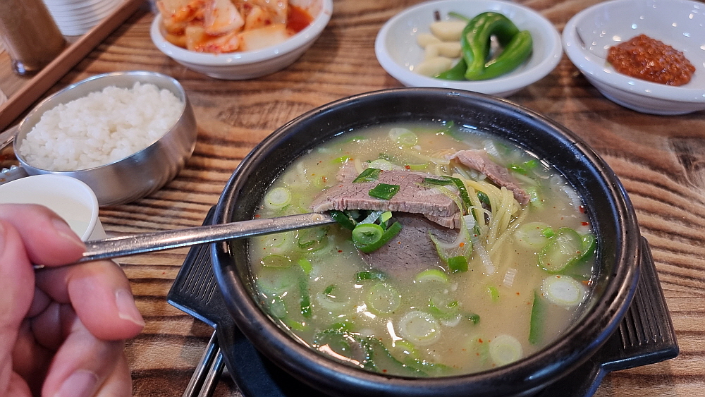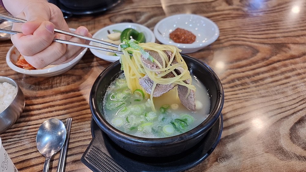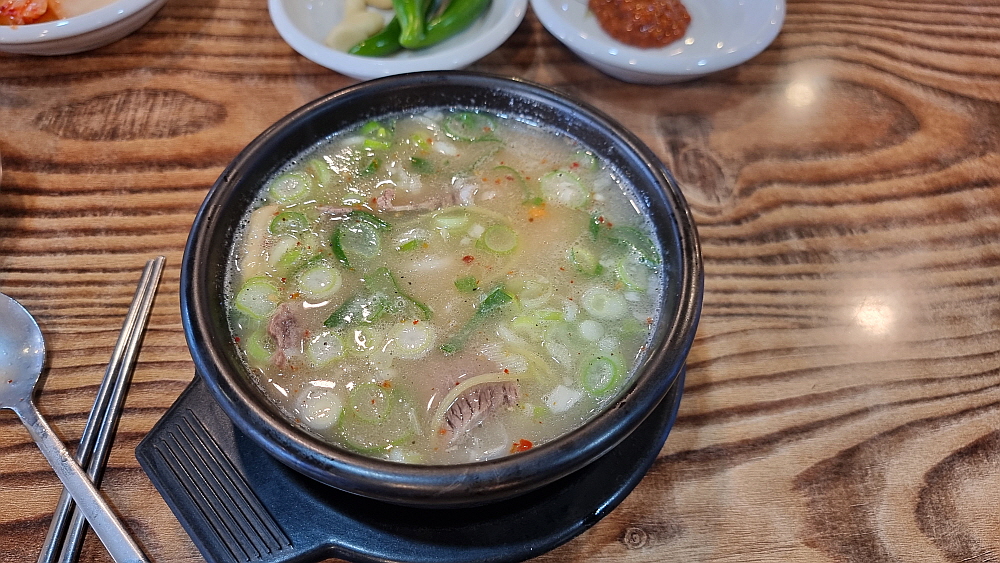 메뉴판에는 특이하게 곰탕과 설렁탕이 모두 선택 가능했다. 보통 곰탕이면 곰탕, 설렁탕이면 설렁탕 이렇게 한 가지 메뉴에 집중하게 마련인데 여긴 그냥 대놓고 두 가지를 모두 판다. 곰탕과 설렁탕의 차이가 무엇인지 손님이 먹어보고 직접 판단하라는 의미같았다. 그래서 우린 둘 다 주문했다. 아는 상식으로 곰탕은 양반들이 주로 먹었던 국물로 뼈를 사용하지 않고, 고기로만 국물을 내서 담백하고 맑은 국물이요, 설렁탕은 고기와 함께 소뼈를 함께 삶아 국물이 뽀얗면서 진한 것이 특징이라는 차이가 있다. 정답인지 모르겠지만 우리가 광안리 서울깍두기에서의 곰탕과 설렁탕은 큰 차이를 느끼지 못했다는거...