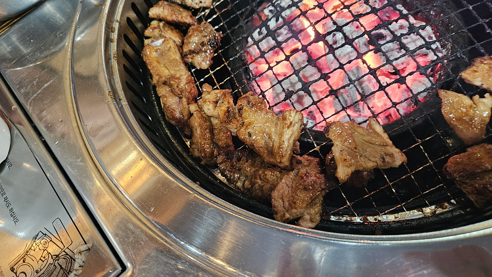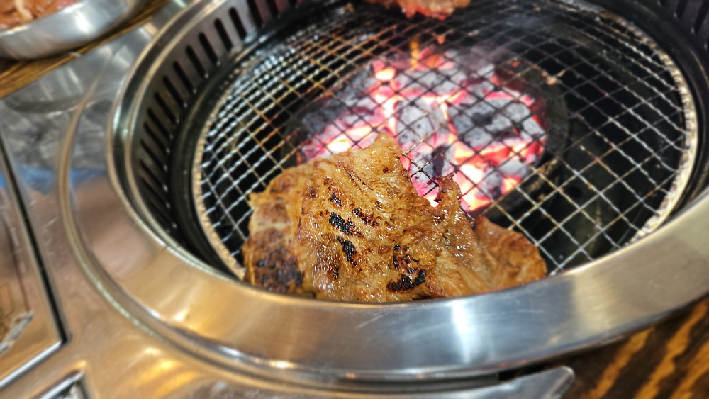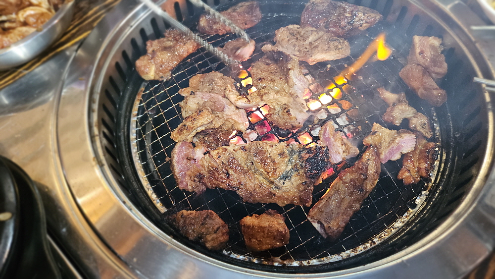 벌건 숯불이 무섭게 타오르고 드디어 갈비가 나오자 그 높은 화력의 숯불 위로 올려졌다. 양념된 돼지갈비는 자꾸 뒤집지 않으면 금새 타버리기 때문에 일행 중 한 사람은 대화에도 참여하지 못하고 연신 돼지갈비를 뒤집는 어려운 임무를 수행해야 한다. 안 그러면 모처럼의 갈비를 홀랑 태울 수 있기 때문이다. 하지만 뜨거운 숯불 위에 올려진 돼지갈비를 뒤집는 일은 참 힘겨운 작업이다. 뜨겁기도 하고, 번거롭기도 한 일이다. 적당히 익은 고기는 불이 약한 옆으로 빼던지 일행들의 접시로 옮겨주는 일도 해주어야 한다. 이래저래 예전엔 팁을 주고 종업원에게 시키던 일이다.