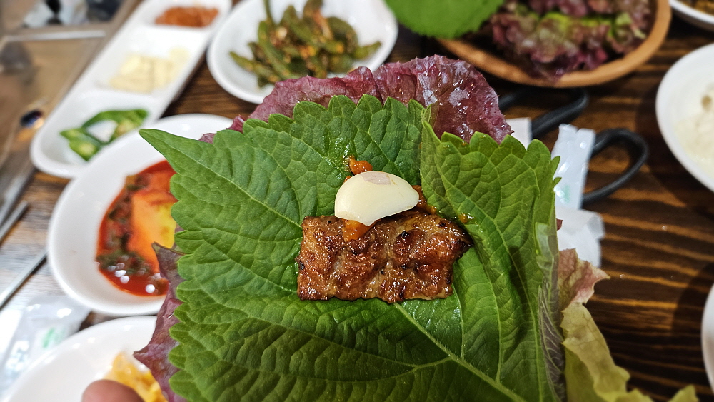 하지만 이렇게 누군가의 고생으로 잘 구워진 돼지갈비 살은 정말 맛이 좋다. 드디어 상추쌈이 등장할 차례다. 그냥 먹어도 맛나지만 아무래도 돼지고기는 상추쌈에 싸서 먹어야 제맛이다. 거기에 마늘 한 점 넣는 것을 잊지 말아야 한다. 한 손엔 만들어진 상추쌈과 한 손엔 소주잔을 들고 다른 사람들도 준비될 때까지 기다려 준다. 그것이 돼지갈비 집에서의 예의라 하겠다. 다들 건배할 준비가 끝나면 누군가의 건배 제의가 이어지고, 마침내 기다려왔던 돼지갈비와의 조우가 시작된다. 이 순간을 위해 그렇게나 오랫동안 맘을 졸이며 기다렸던 것이다. 정말 맛나고, 훌륭한 저녁 회식거리이자 안주라 하겠다.