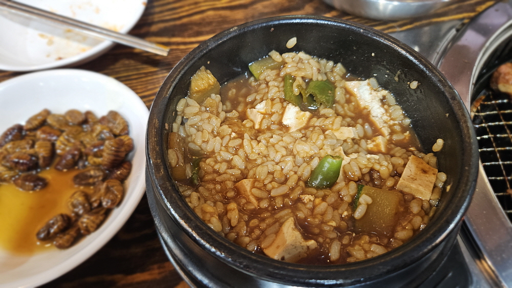 숯불의 화력이 너무 좋아 갈비가 순식간에 익어 버리기 때문에 수다떠는 사람들은 혹 돼지갈비를 몇 점 못 먹을 수 있다. 그래서 수다떠는 사람들을 위해 된장찌개 밥 안주도 준비했다. 진한 국물의 된장찌개에 밥 한 공기를 그대로 투입하여 먹는 것이 밥안주인 된장찌개인 것이다. 좀 식었다 싶으면 냄비째 숯불 위에 올려 놓은면 된다. 다목적 안주이자 반찬인 셈이다. 돼지갈비는 숯불에 주로 먹기 때문에 나중에 볶음밥을 먹지 못하는 아쉬움이 있는 그런 부족함은 된장찌개 밥안주가 메워주는 셈이다. 어쨌든 이날은 살이 좀 찌는 날이었다. 좋은 안주와 술이 계속 돌고, 이야기 꽃은 화려하게 피어나는 밤이었다. 원래 돼지갈비는 이런 맛에 먹는 것이다.