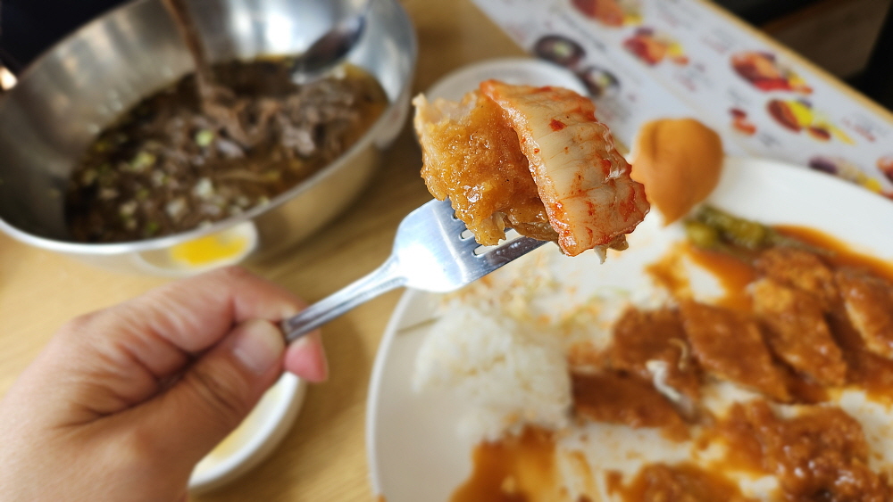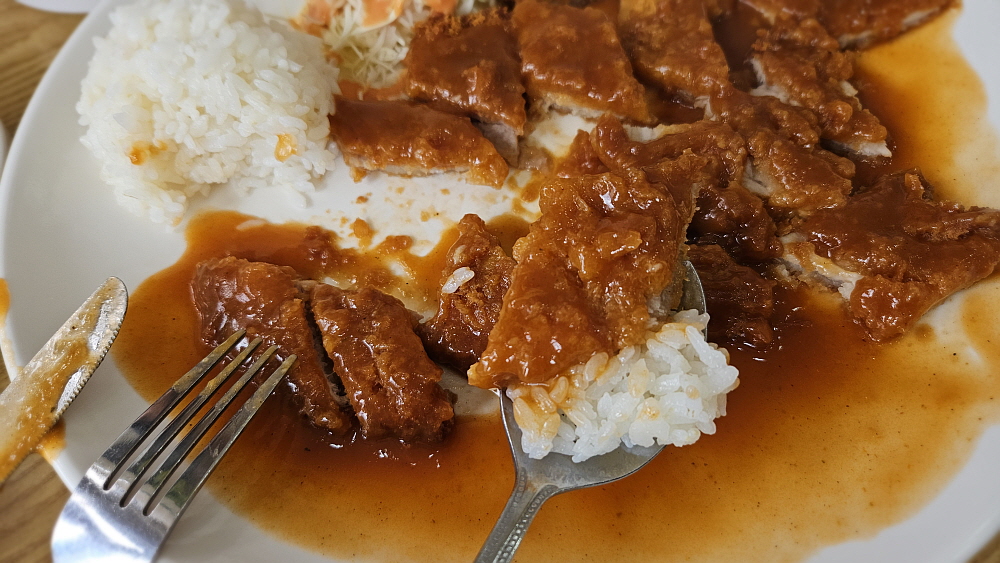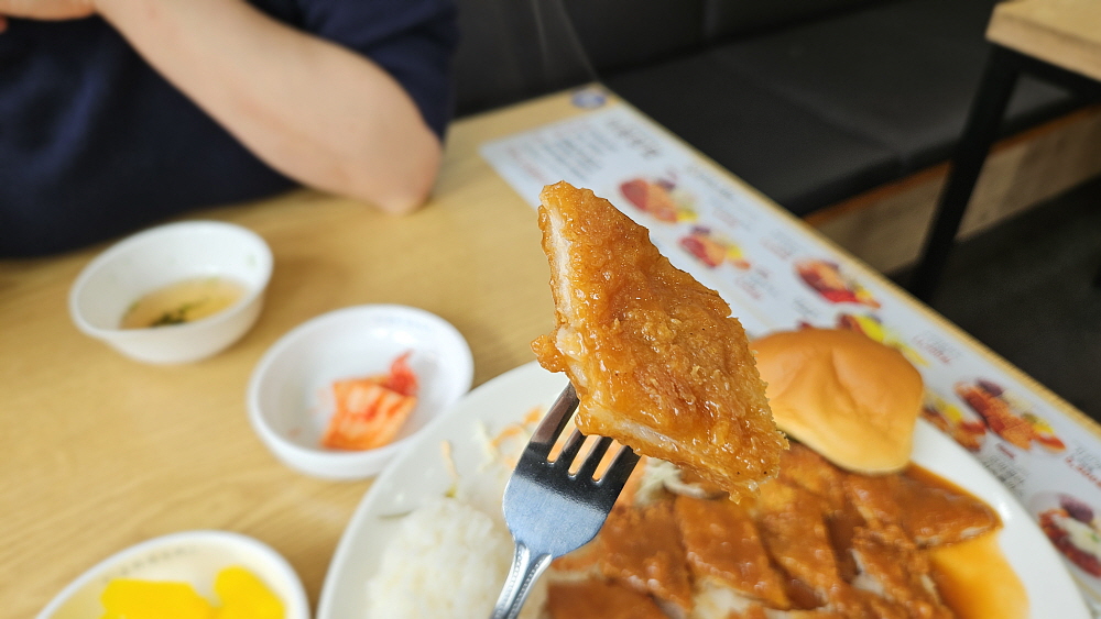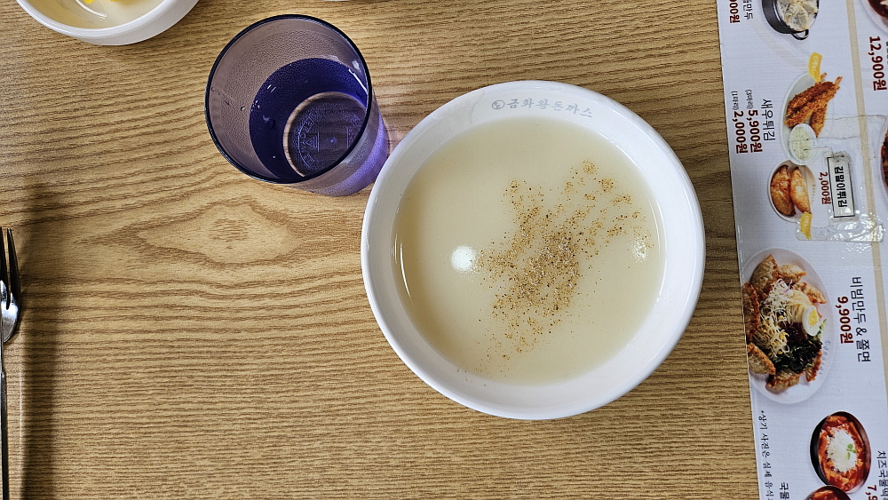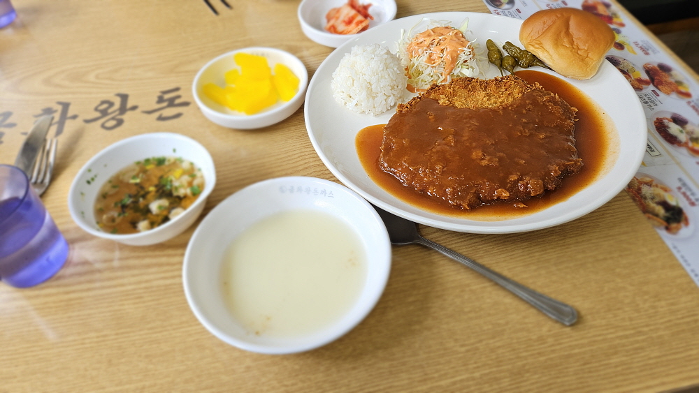 하지만 크기는 장난이 아니다. 아주 큰 편이다. 돈가스가 나오기 전에 셀프로 스프와 우동 국물을 먼저 먹을 수 있다. 슬픈 이야기의 주인공이 되지 않으려면 절대 스프만 먹고 나가면 안 된다. 셀프 스프지만 맛은 훌륭했다. 이런 에피타이저라면 몇 번이고 먹을 수 있겠지만, 워워 자제하고 본 경기에 집중하기 위해 일단 한 번만 먹기로 했다. 돈가스가 어찌나 크고 늠름하던지 감탄하지 않을 수 없었다. 이런 크기의 돈가스를 이 가격에 팔다니 여기 주인은 복 받을 것이다. 쌀밥이 조금 나오고, 햄버거 빵 같은 것도 있다. 이미 크기에서 압도된 우리는 무척이나 만족스러운 기분이었다.